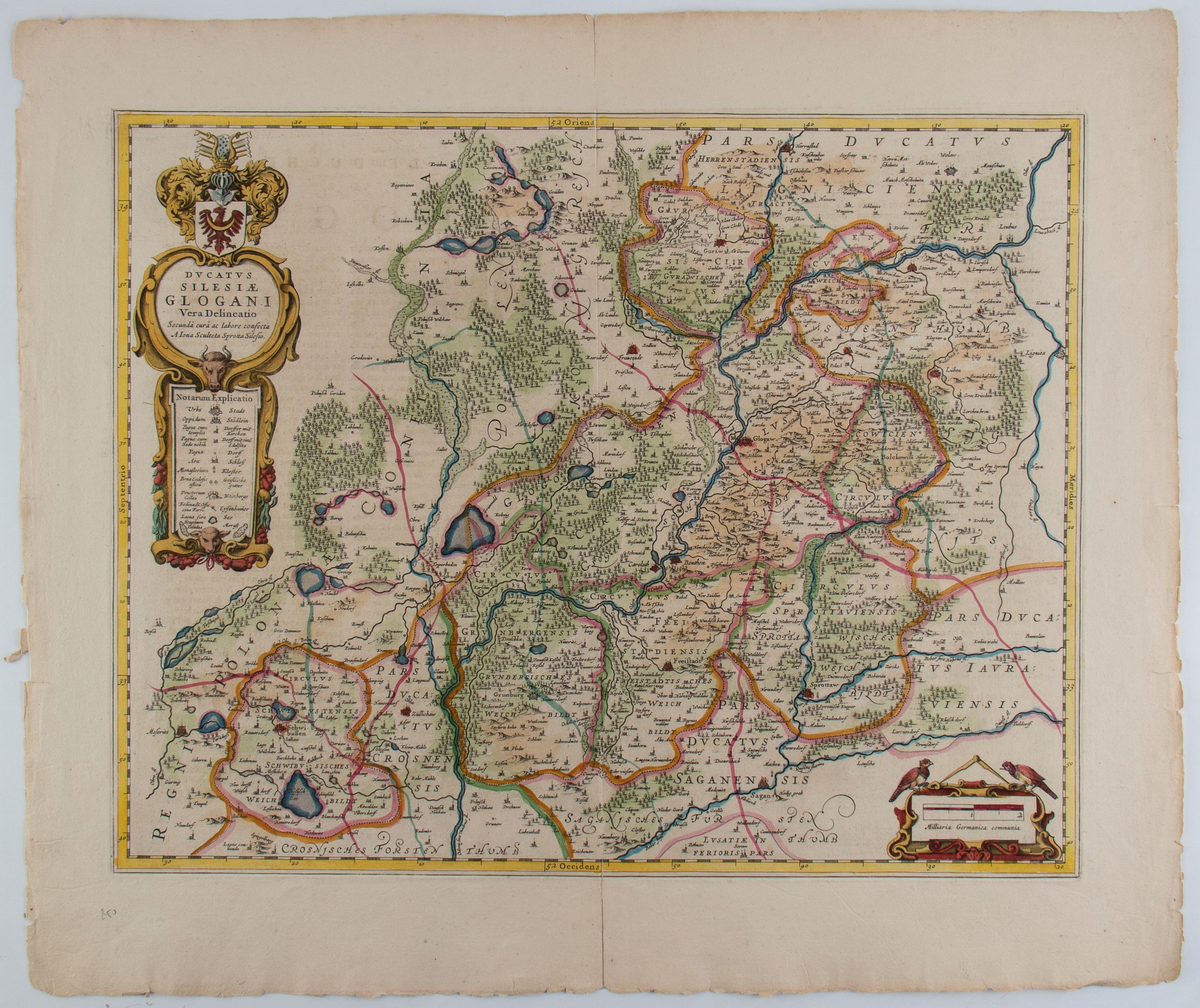Acquaforte e bulino, 534 x 632 mm. Mappa del municipio di Glogów, oggi nella Bassa Slesia in Polonia, sulla riva sinistra del fiume Oder. Impressione molto bella su carta vergata, con il testo in francese al verso e bellissima coloritura a mano. Grandi margini preservati. Consueta piega editoriale. In ottimo stato, salvo leggera brunitura e usure lungo i bordi.