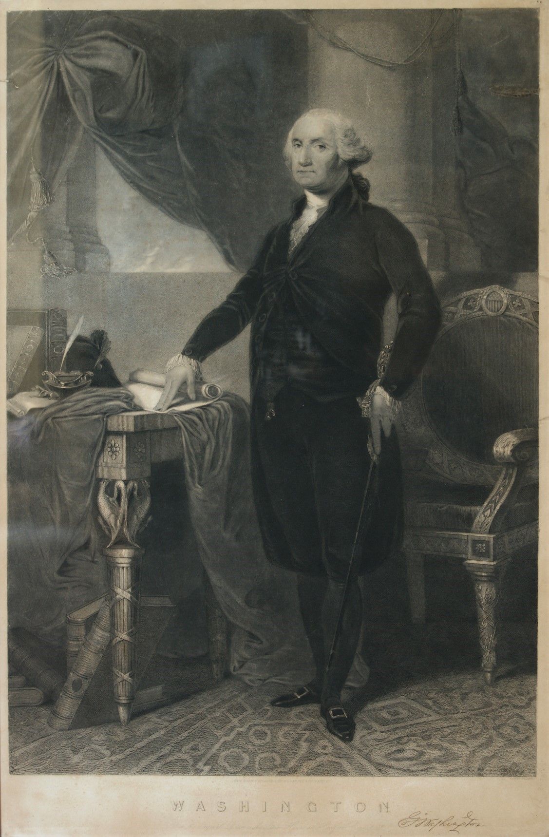incisione da John Halpin dal dipinto oggi conservato nella Old State House di Hartfort in Connecticut. Mezzotinta, 443 x 680 mm (foglio). Pubblicata da Garvin & Co. a New York dopo 1848. Bella e ricca impressione su carta non vergata. Esemplare con alcuni strappi ben restaurati sul verso e bordi rinforzati. Foglio uniformemente brunito.