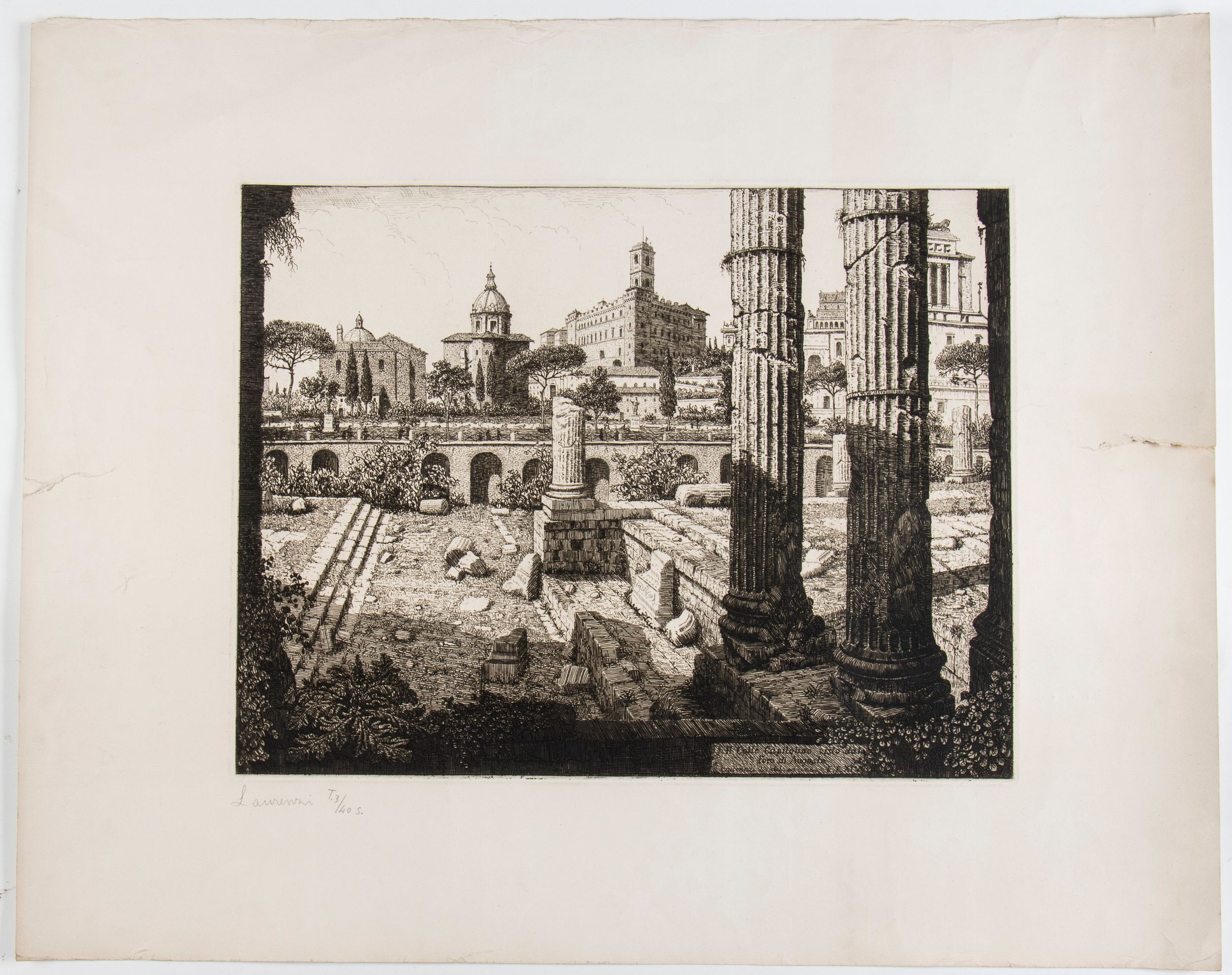 Acquaforte, 375 x 495 mm (lastra), 595 x 750 mm (foglio). Firmata a matita, tiratura 3/40 Molto bella e molto fresca impressione su carta non vergata. Foglio in ottimo stato di conservazione, salvo un lungo strappo sul margine destro.
