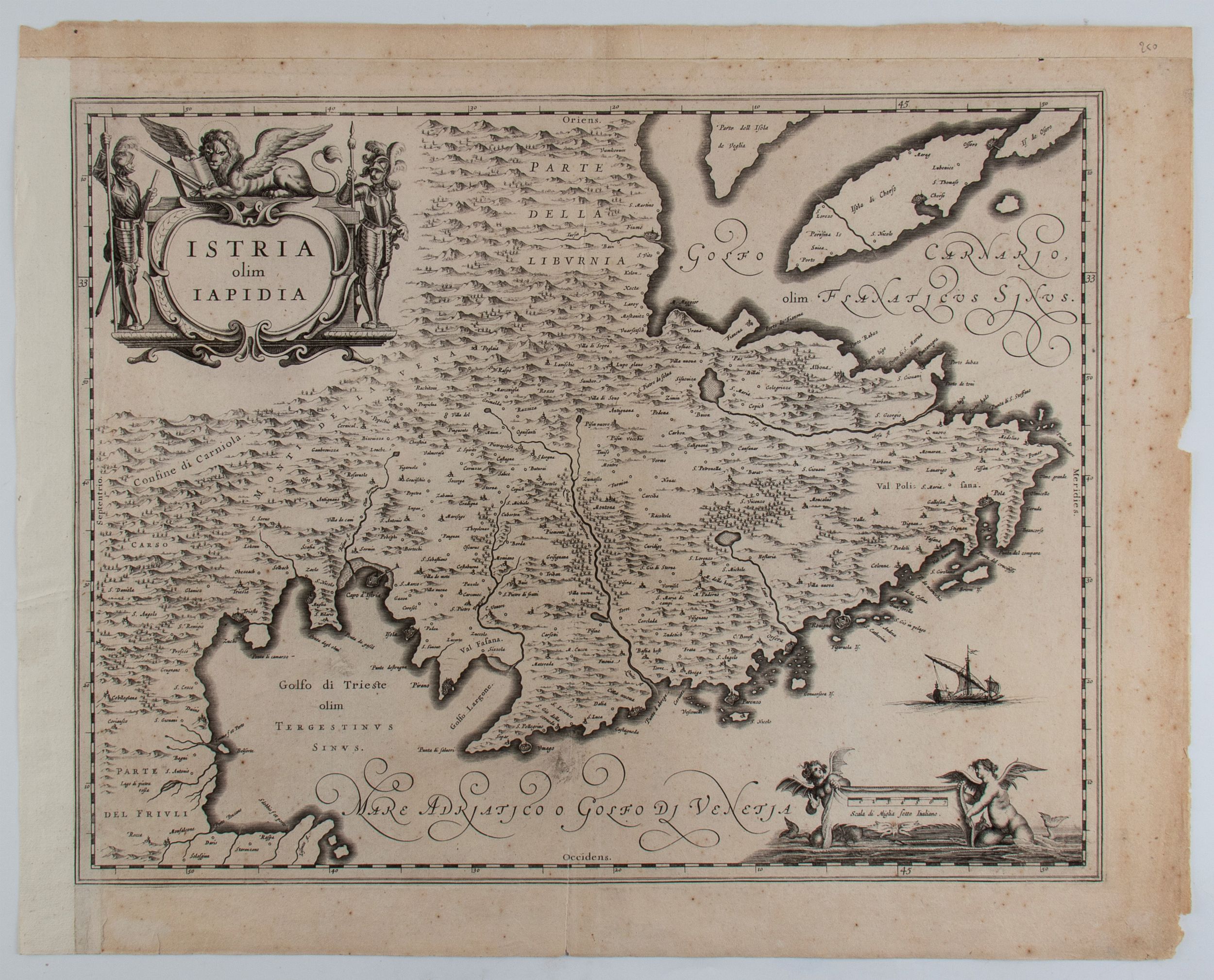 Acquaforte e bulino, 456 x 568 mm. Mappa del territorio di Istria basata sul modello di Giovanni Antonio Magini. Esemplare stampato su carta vergata, con margine sinistro e superiore ricostruiti. Presenta alcuni strappi, segni di fioritura, bruniture e sgualciture. Consueta piega editoriale.