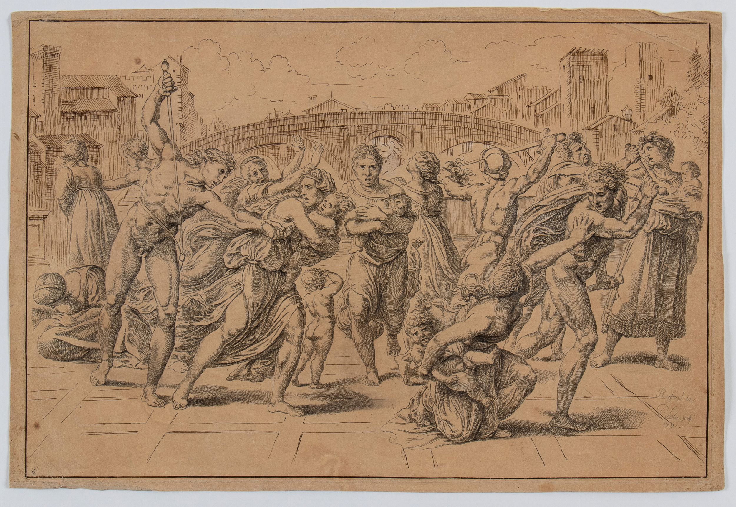 1790 da Marcantonio Raimondi. Acquaforte, dettagli a penna con inchiostro bruno, 440 x 298 mm. Esemplare in discreto stato di conservazione con foglio integro rifilato oltre il margine lastra, stampato su carta pesante avorio.