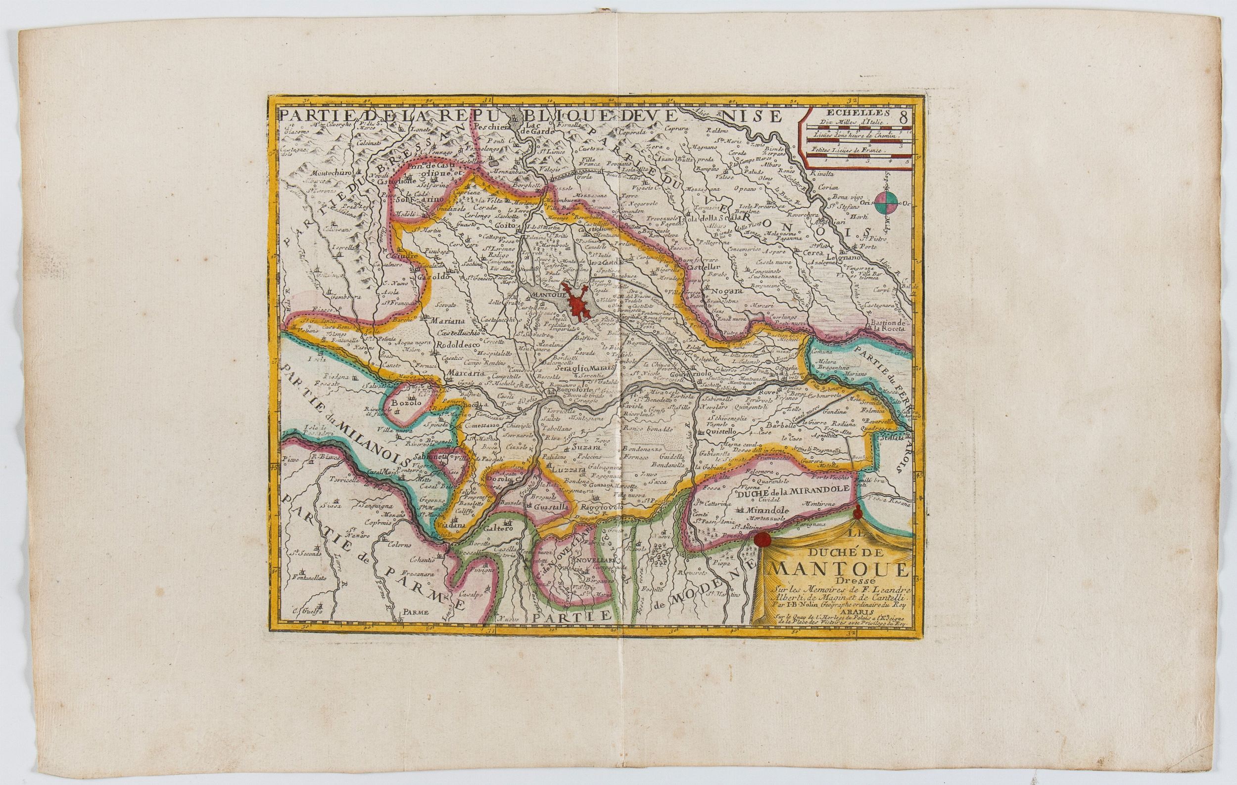 Acquaforte e bulino, 240 x 286 mm (lastra), 330 x 507 mm (foglio). Mappa del territorio del Ducato di Mantova. Bell'esemplare su carta vergata. In ottimo stato generale, acquarellato a mano, con grandi margini e la consueta piega editoriale. Presenta leggerissimi segni di brunitura sui margini.