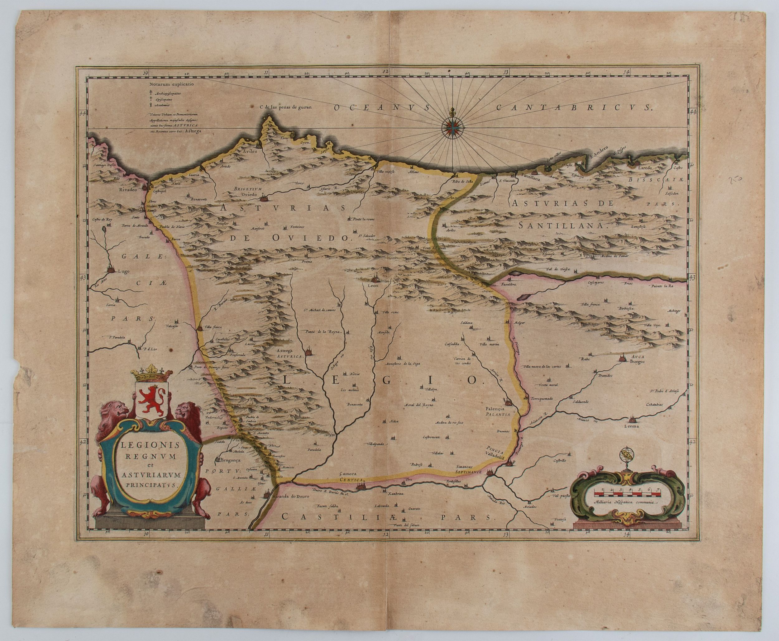 1635 Acquaforte e bulino, 500 x 600 mm. Mappa dell'antica regione di Léon e Asturie nel nord della Spagna. Impressione colorata a mano, stampata su carta vergata, con testo in francese al verso. Consueta piega editoriale. Carta brunita, in discreto stato di conservazione.