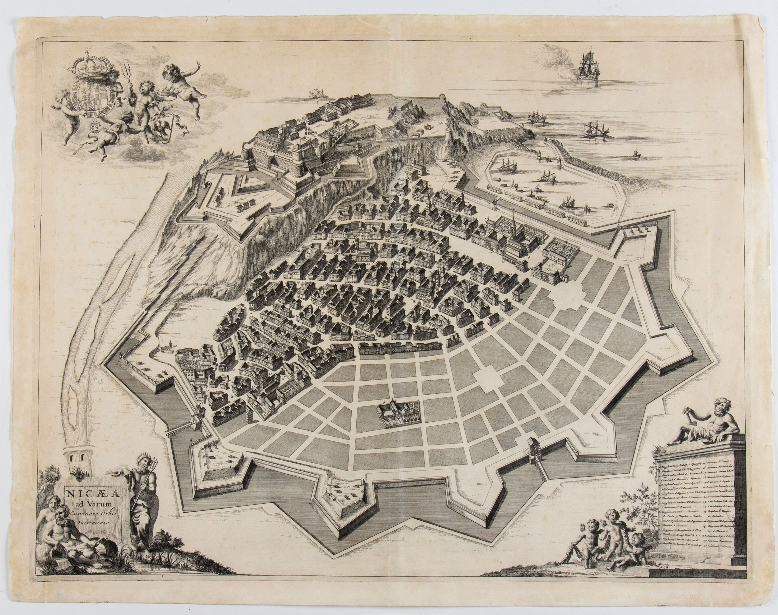 Acquaforte e bulino, 525 x 670 mm (foglio). Veduta di Nizza tratta da 'Theatrum. Statuum Sabaudiae' Bella impressione su carta vergata con grande filigrana. Buono stato di conservazione, salvo scolorimento da esposizione, alcune leggere macchie e usure lungo i bordi. Traccia della consueta piega editoriale.