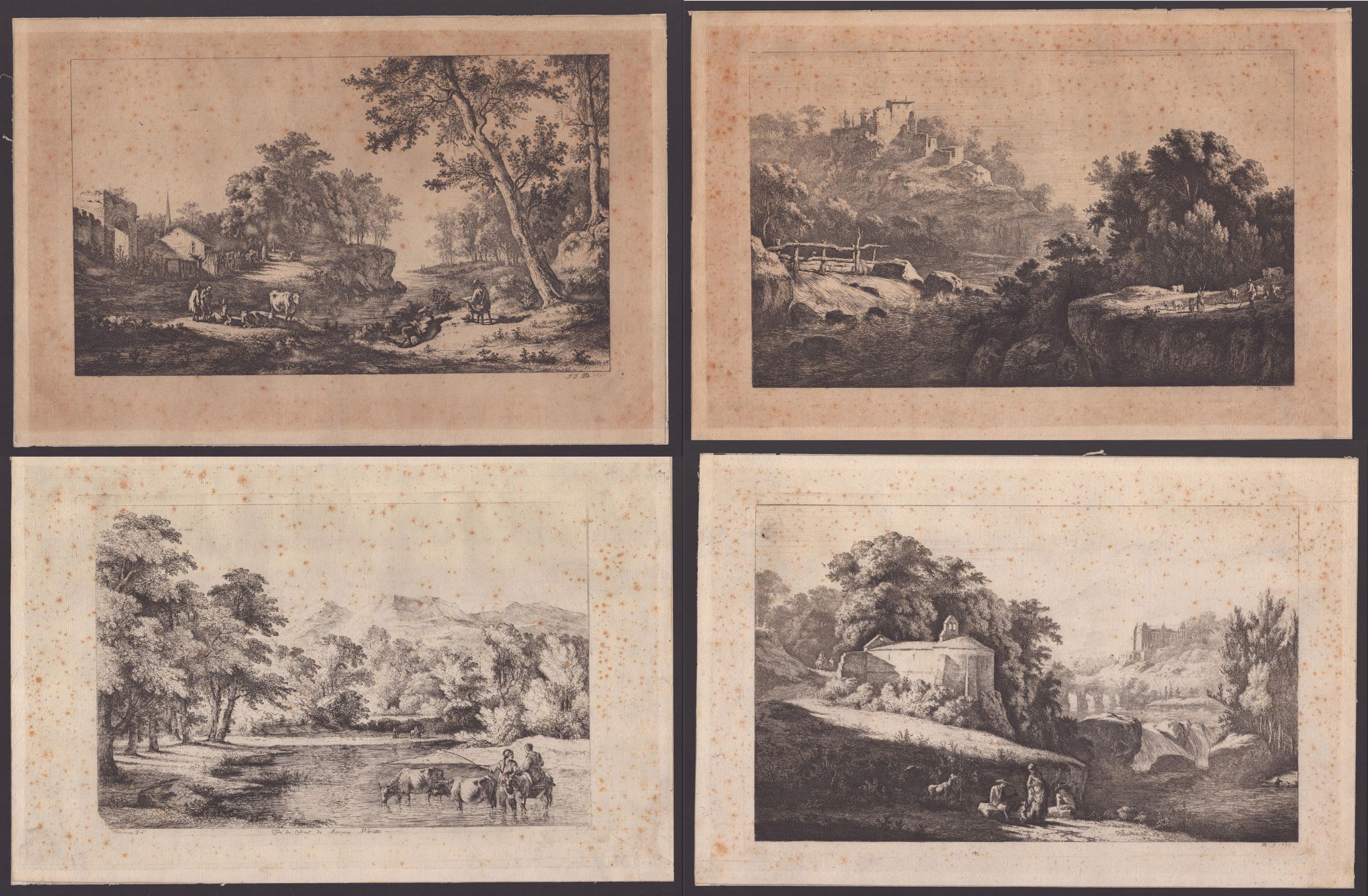 Lotto di quattro incisioni. Acquaforte e puntasecca, 265 x 405 ca. (cad. foglio). Stampate su carta vergata. Fogli in buono stato, salvo fioriture sparse e bruniture uniformi in due esemplari. Ogni foglio con bordi rinforzati al verso.