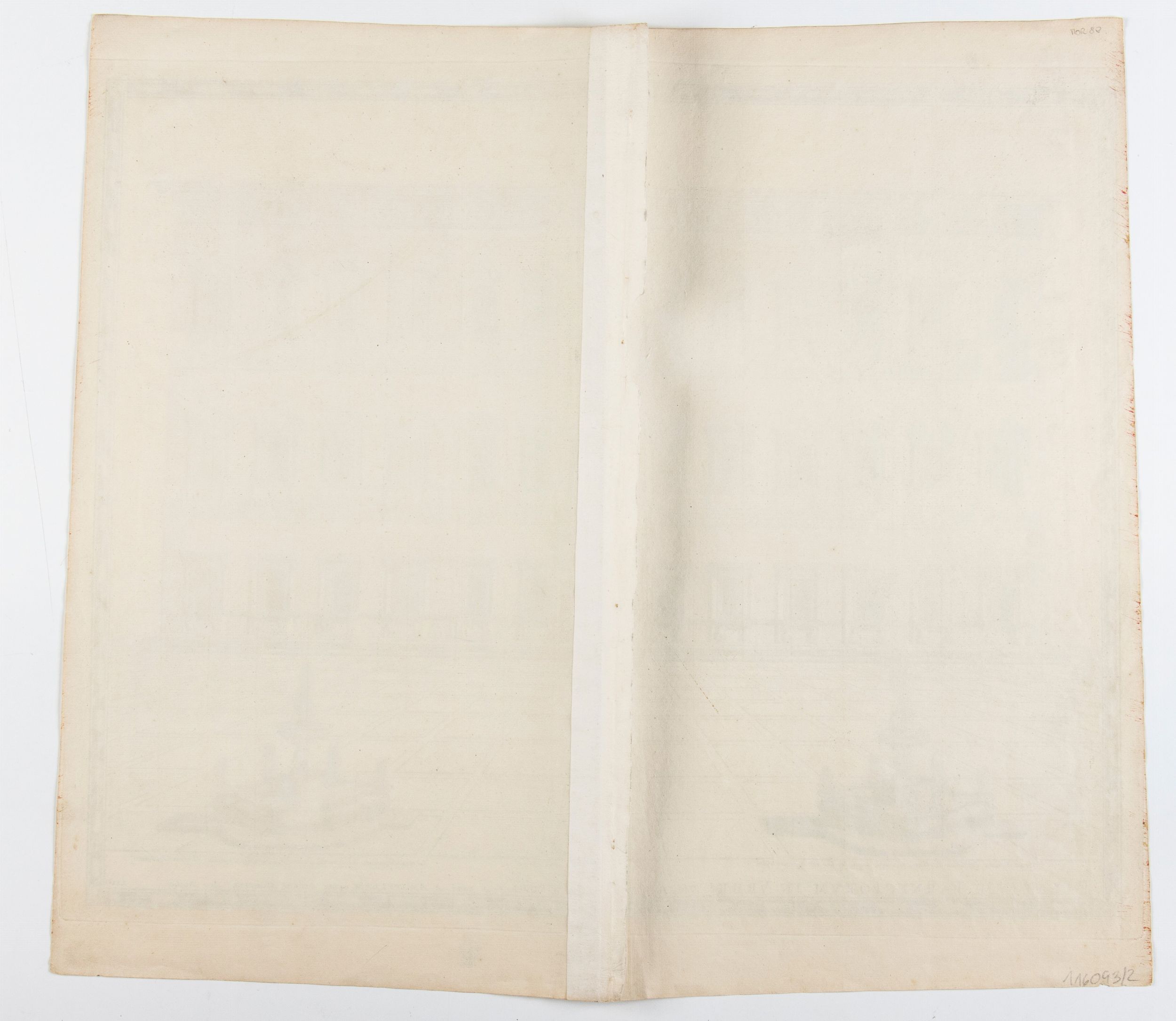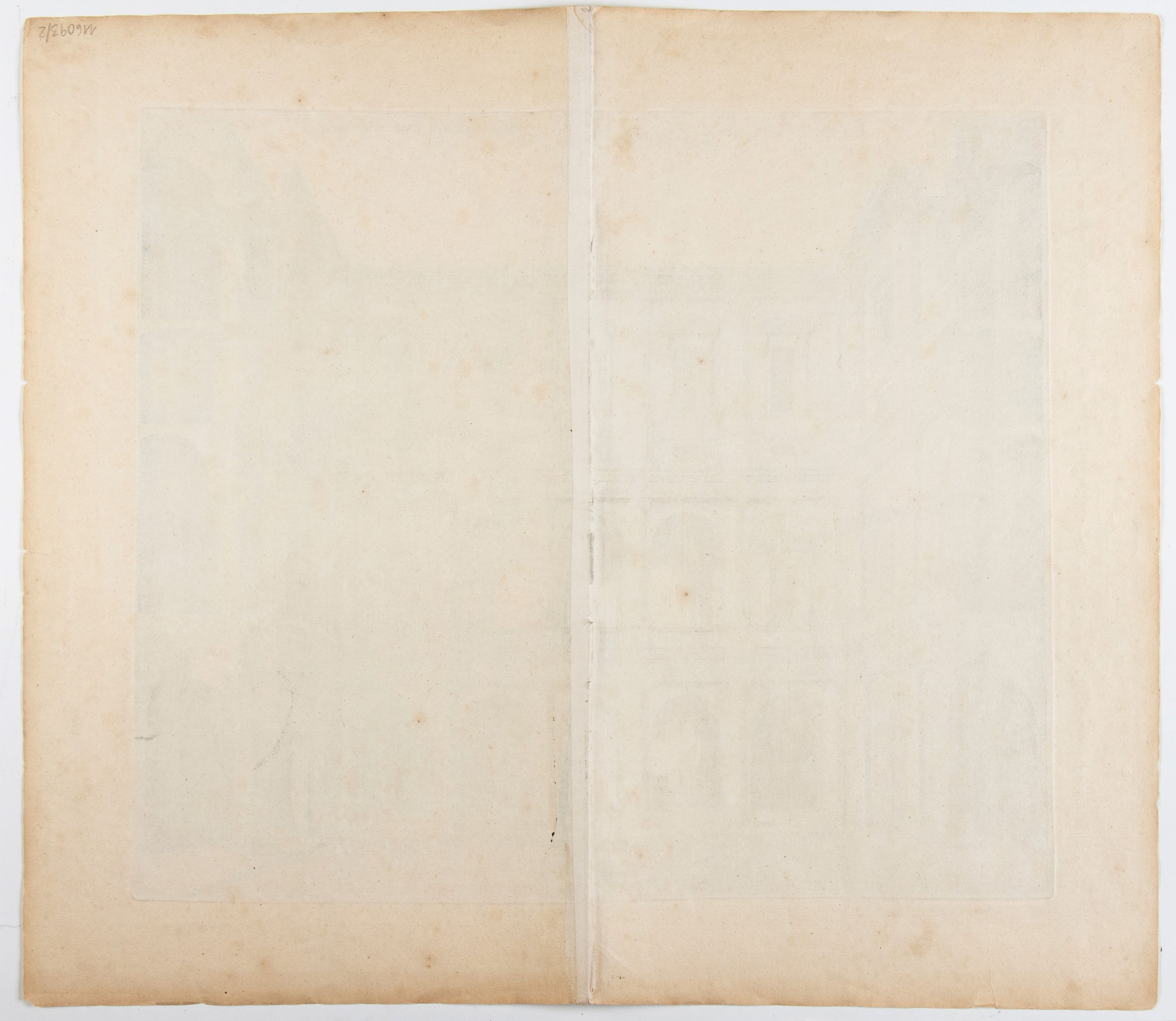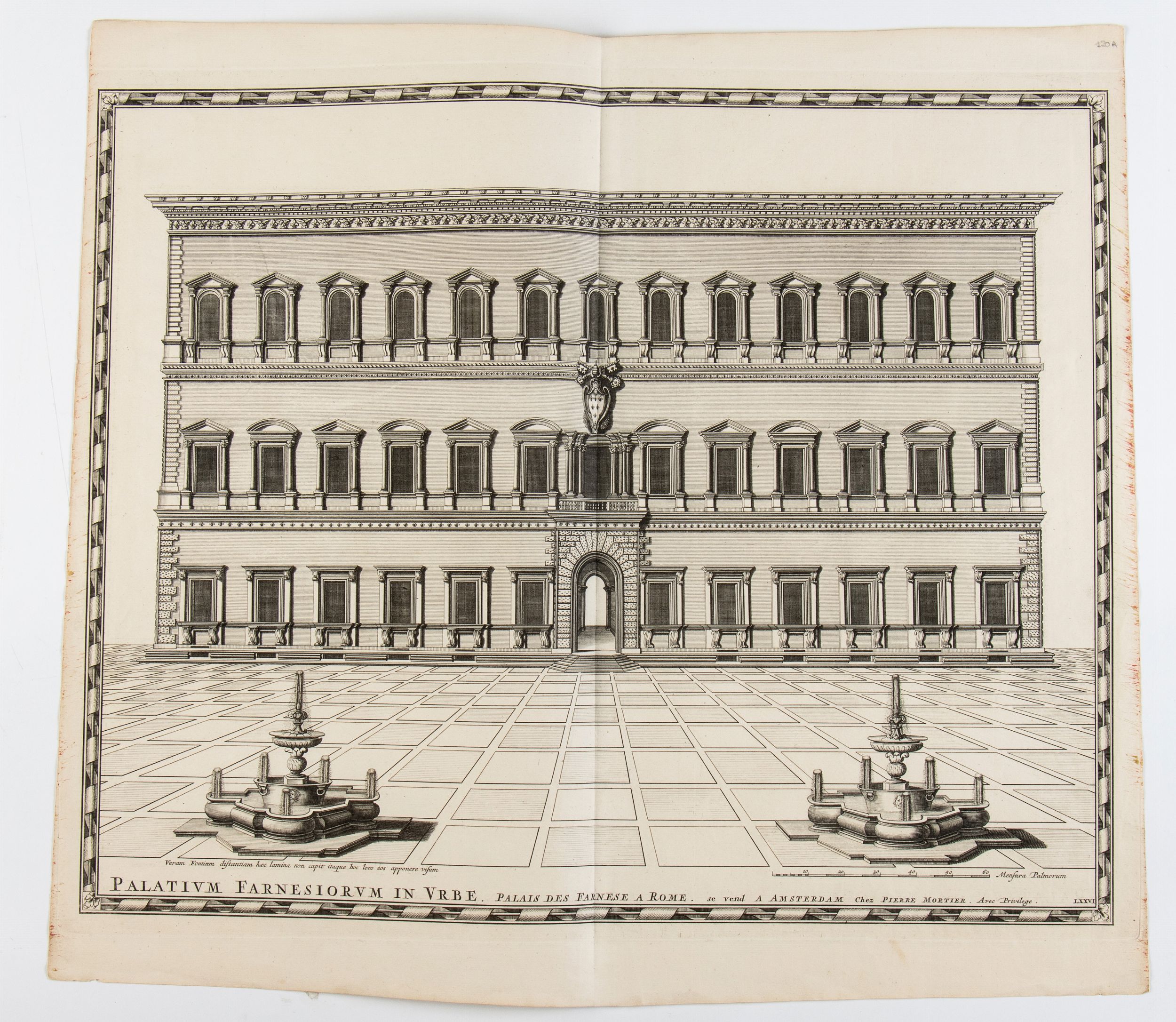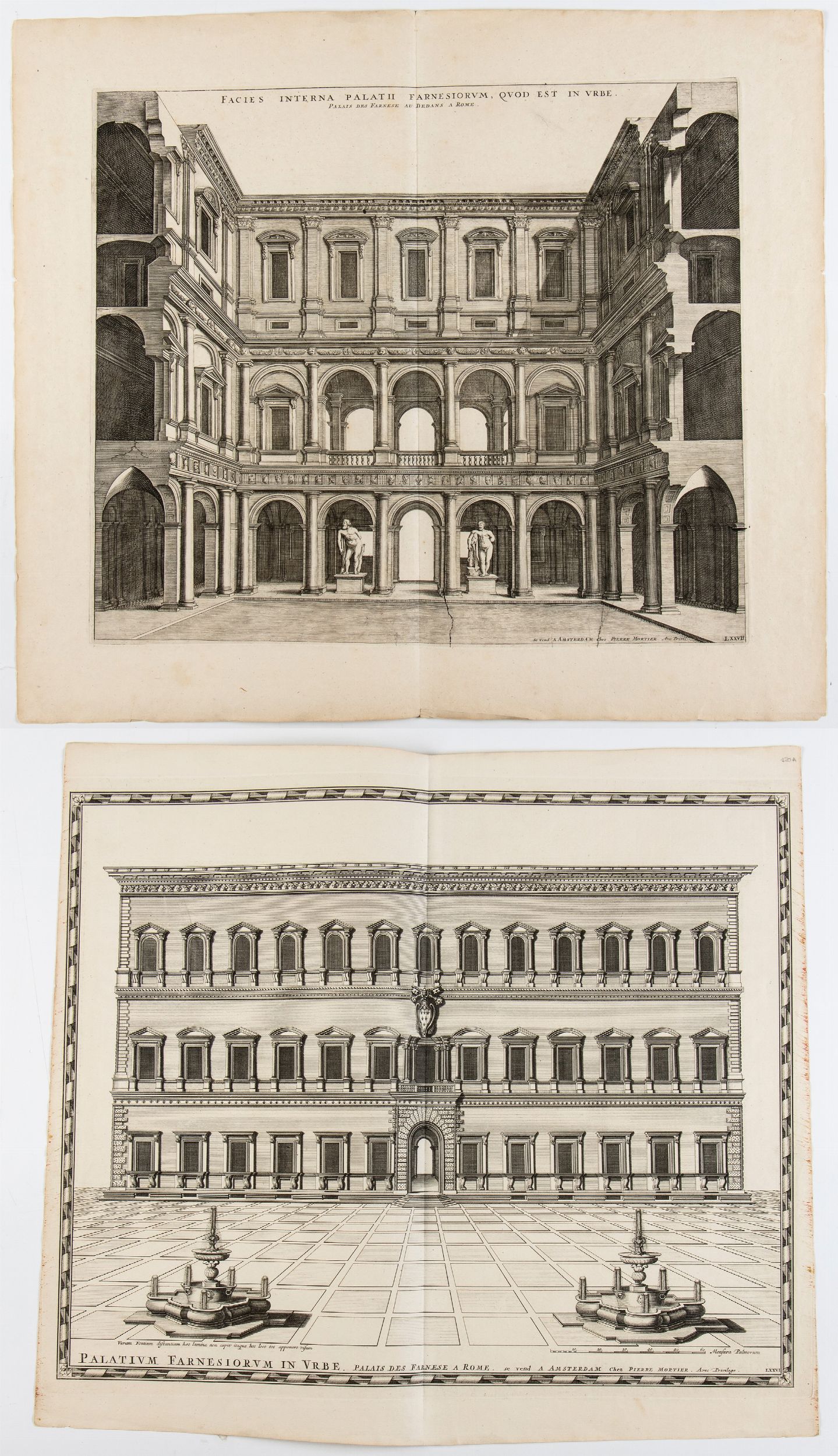 Lotto di due vedute di Palazzo Farnese a Roma. Bulino e acquaforte, 465 x 580 mm e 430 x 495 mm (lastre), 515 x 590 e 540 x 610 mm (fogli). Belle impressioni, ciascuna stampa su due fogli di carta vergata uniti, con consueta piega centrale. In generale, in ottimo stato; foglio con la veduta interna con brunitura uniforme.