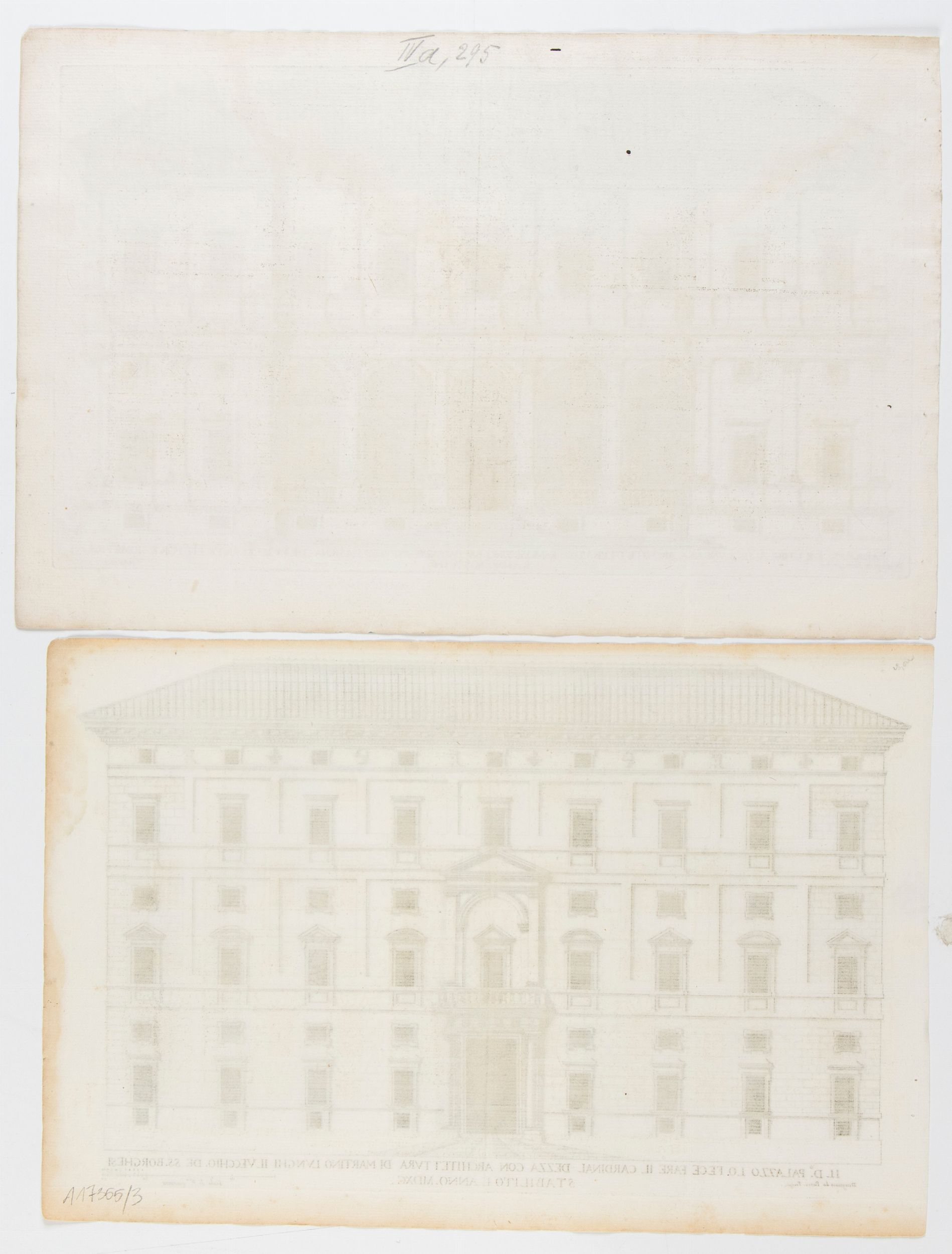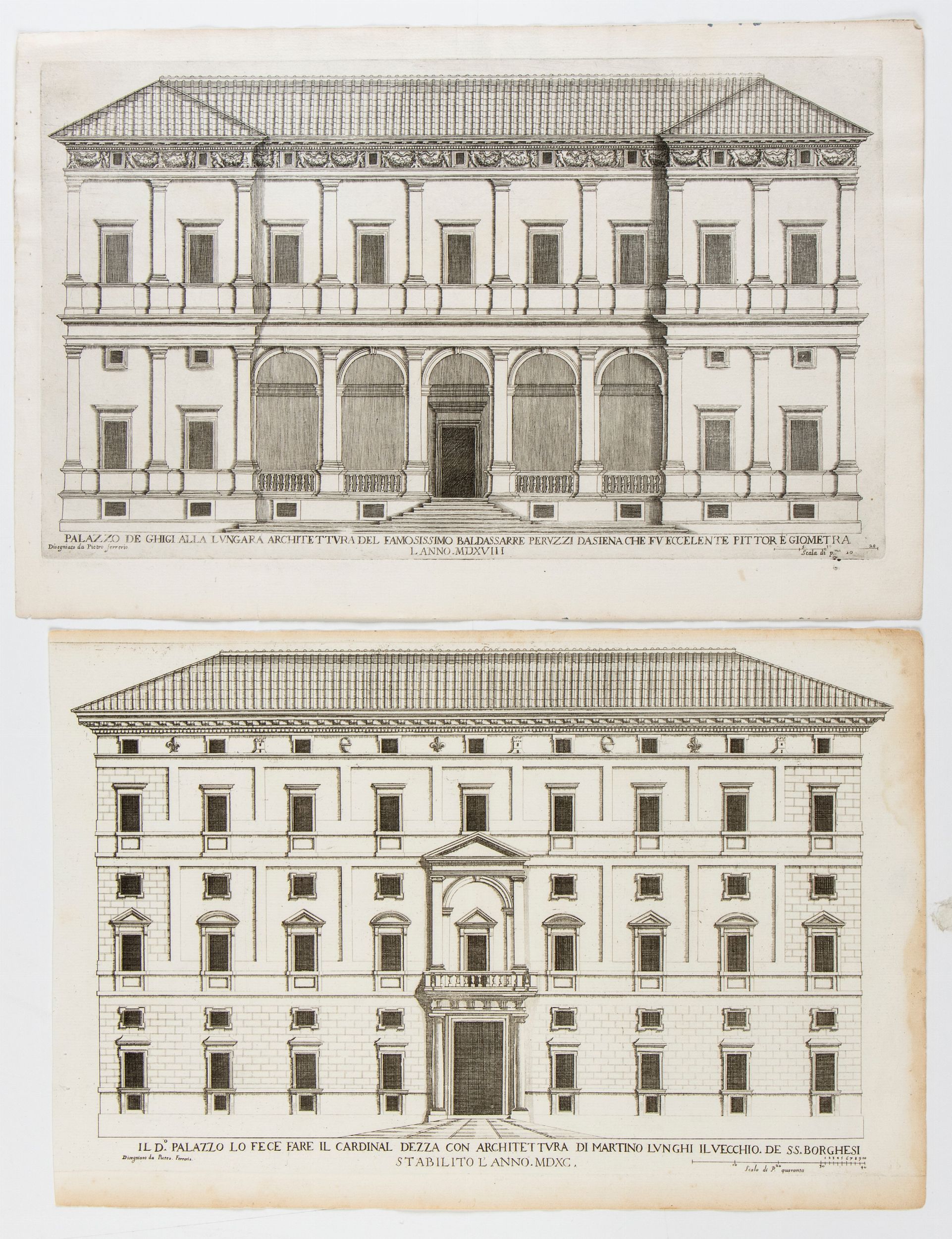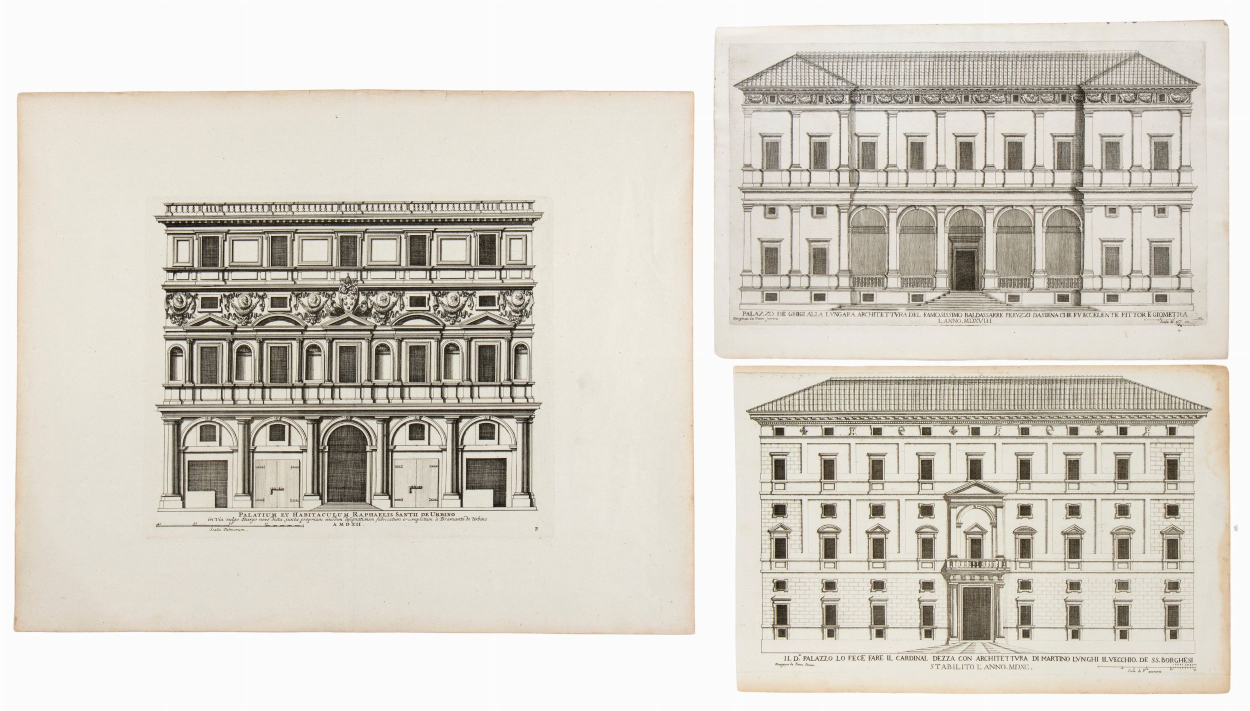 Lotto di tre incisioni tratti da 'Palazzi di Roma de piu celebri architetti, disegnati da Pietro Ferrerio pittore et architetto'. Bulino, 270 x 414; 267 x 402; 394 x 492 mm. Molto belle impressioni (Palazzo Chigi con plate-tone), stampate su carta vergata con filigrana. In ottimo stato di conservazione, salvo bruniture lungo i bordi.