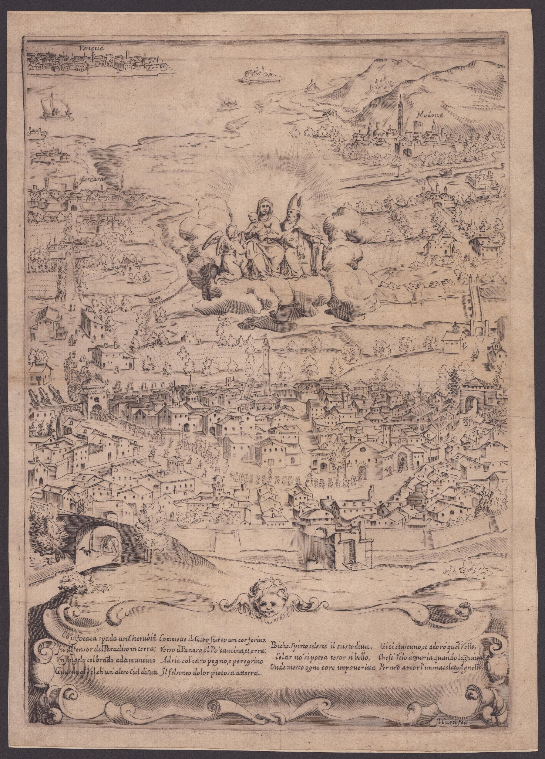 Acquaforte, 342 x 214 mm (lastra), 363 x 261 mm (foglio). Veduta di Bologna con la Madonna, Gesù e San Petronio seduti su una nuvola, circondati dalle città di Modena, Ferrara e Venezia. Firmata: F. Curti fec. Non in Le Blanc. Nitida impressione su carta vergata. Esemplare controfondato su un altro foglio di carta vergata. Per il resto, in ottime condizioni salvo tracce di pieghe orizzontali centrali.