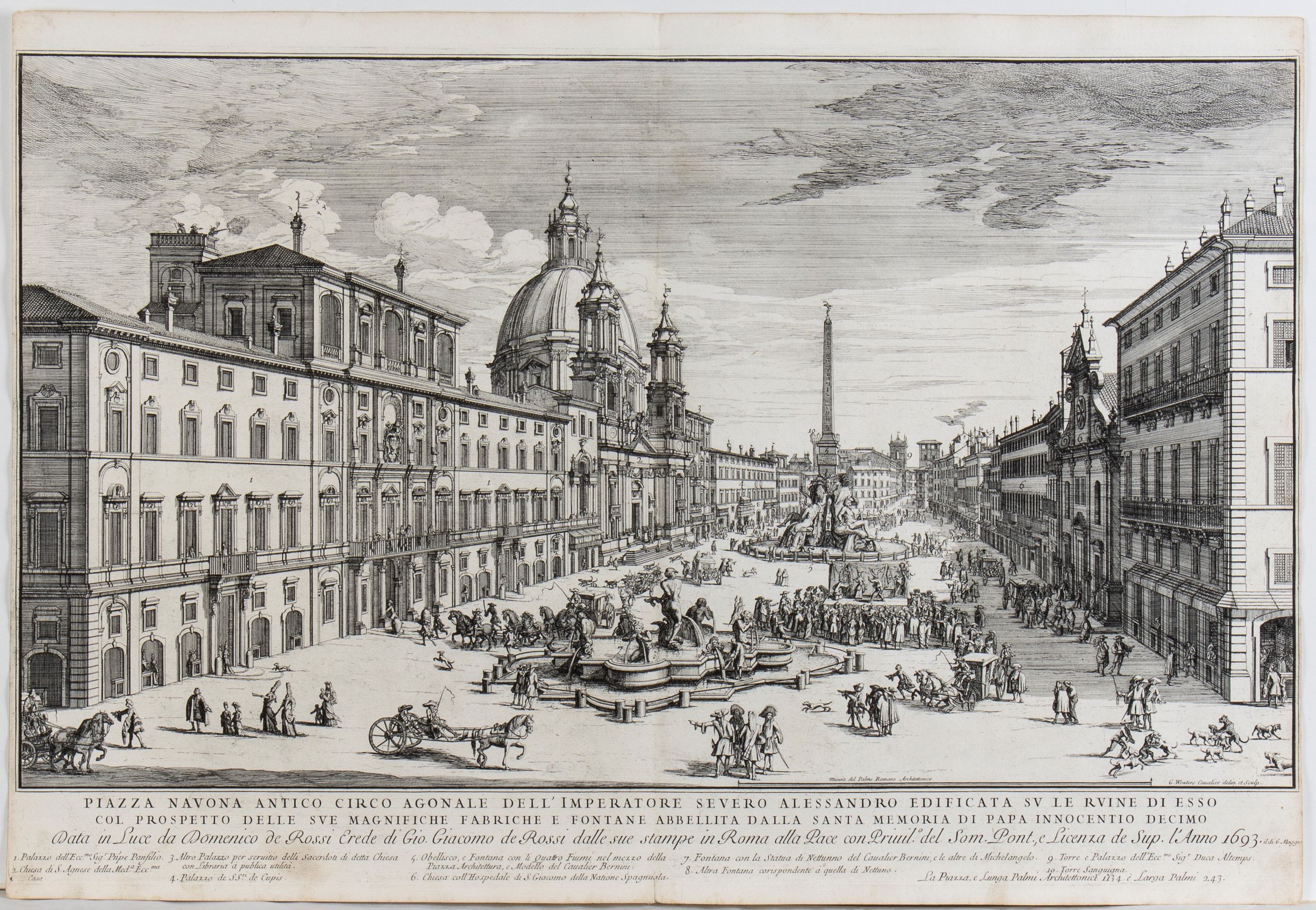 Acquaforte, 482 x 700 mm (foglio). Molto bella impressione su carta vergata spessa. Foglio con sottilissimi margini a destra e a sinistra e margini più grandi in alto e in basso. In buono stato di conservazione, salvo la consueta piega centrale e due piccoli fori al centro, restaurati.
