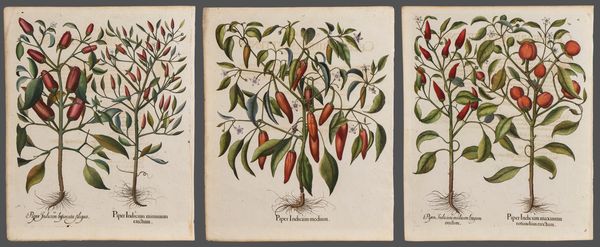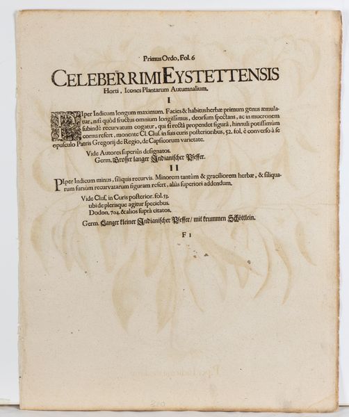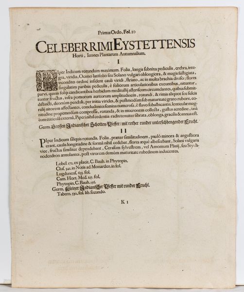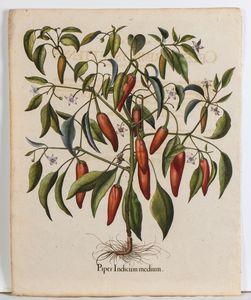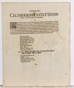 Lotto di tre tavole tratte dal famoso erbario Hortus Eystettensis (1613). Bulino e acquaforte, 525 x 420 mm (cad. foglio). Bellissime impressioni con splendida coloritura coeva. Stampate su carta vergata. Visibile il segno della battuta. In ottimo stato di conservazione.