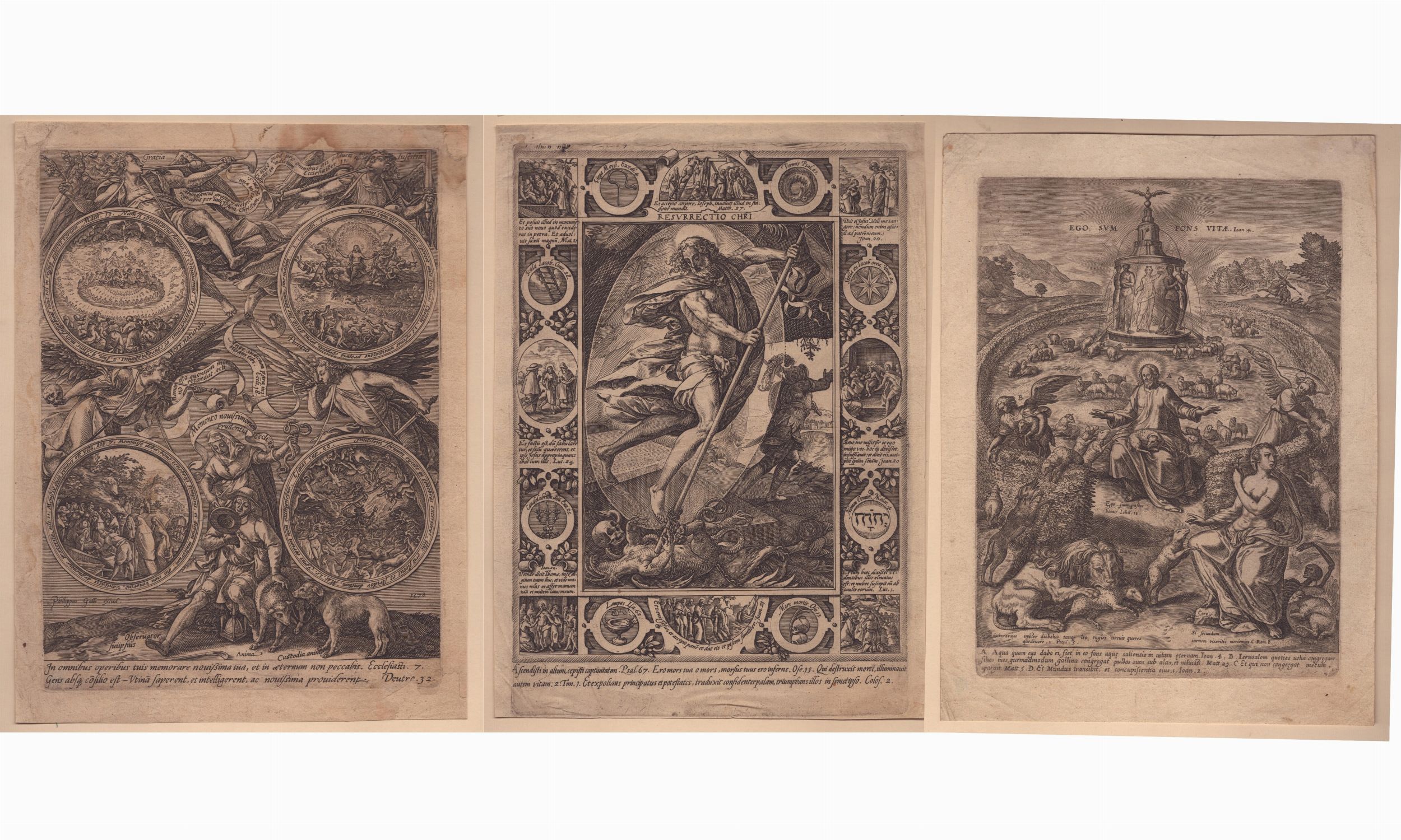 1578 Lotto di 3 incisioni: Resurrezione di Cristo. Bulino, 271 x 187 mm (lastra), 281 x 204 mm (foglio). Bellissima, fresca impressione con tonalità di lastra, stampata su carta vergata sottile. Esemplare con i margini di circa 1cm su tre lati ed un sottile margine inferiore. . In ottime condizioni salvo delle pieghe. Allegoria della Prudenza . Bulino, 253 x 186 mm (lastra), 278 x 211 mm (foglio). Pubblicata da Philipp Galle. Bella, fresca impressione con tonalità di lastra, stampata su carta vergata sottile. In buone condizioni salvo le mancanze agli angoli a destar, un macchia stesa in alto e qualche piega. Incluso: Anonimo incisore, Ego sum fons vitae (Ioan. 4. ). Bulino, 252 x 185 mm (lastra), 299 x 220 mm (foglio). Fresca e nitida impressione stampata su carta vergata sottile con filigrana. In ottime condizioni salvo delle pieghe e leggere brunitura di carta uniforme. Tutte le tre con al verso il marchio di collezioni di HUBERT GEORGES DÉSIRÉ DUPOND (1901-1982) (Lugt 3926)