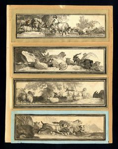 Scuola francese del XVII secolo Lotto di 4 disegni. Penna e inchiostro bruno, su carta beige, 45 x 145 mm ca. [..]