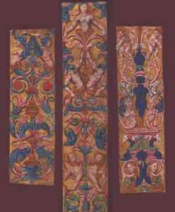 Anonimo del XVI/XVII secolo Lotto di 3 fogli. Pigmenti policromi e foglia d'oro su pergamena, 315 x 95, 340 x [..]