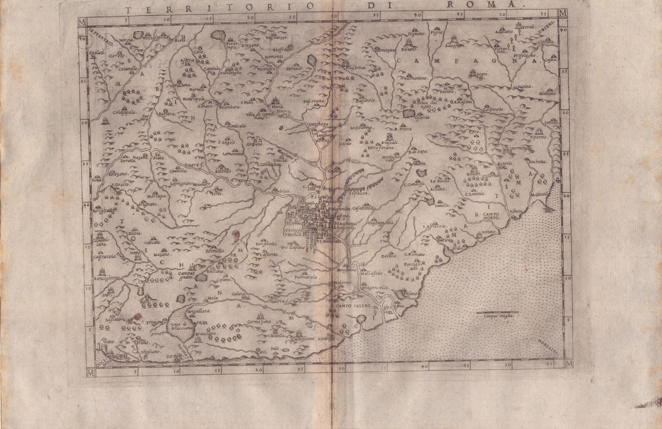 1561 ca. Acquaforte, 191 x 273 mm (lastra), 220 x 310 mm ca. (foglio). Mappa dell territorio di Roma tratta da 'La Geografia ... Nuovamente tradotta di Greco in Italiano, da Girolamo Ruscelli…' di Claudio Tolomeo. Fresca impressione su carta vergata. In ottimo stato di conservazione salvo consueta piega editoriale e delle usure lungo la piega. Con cornice (32 x 42 x 2 cm).