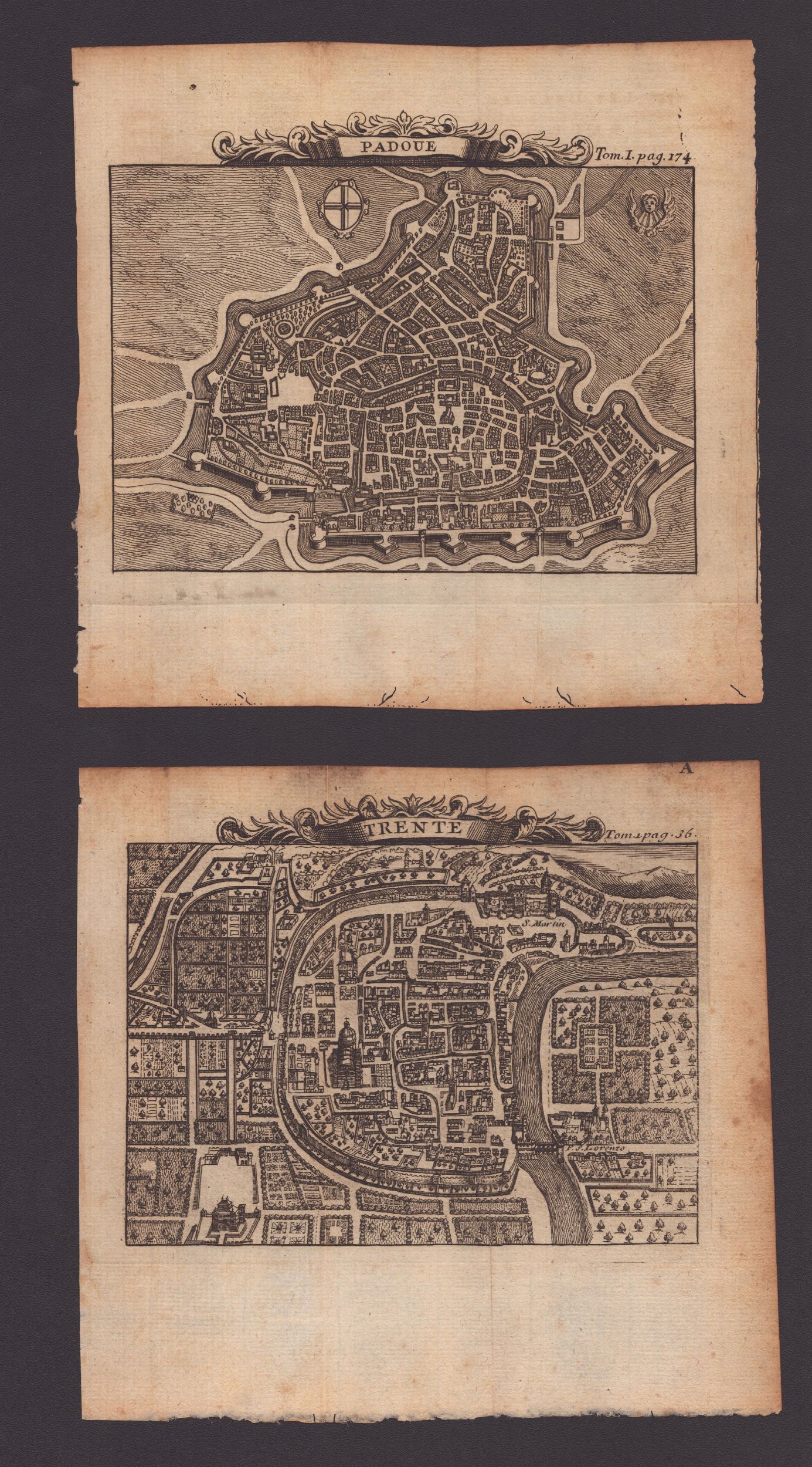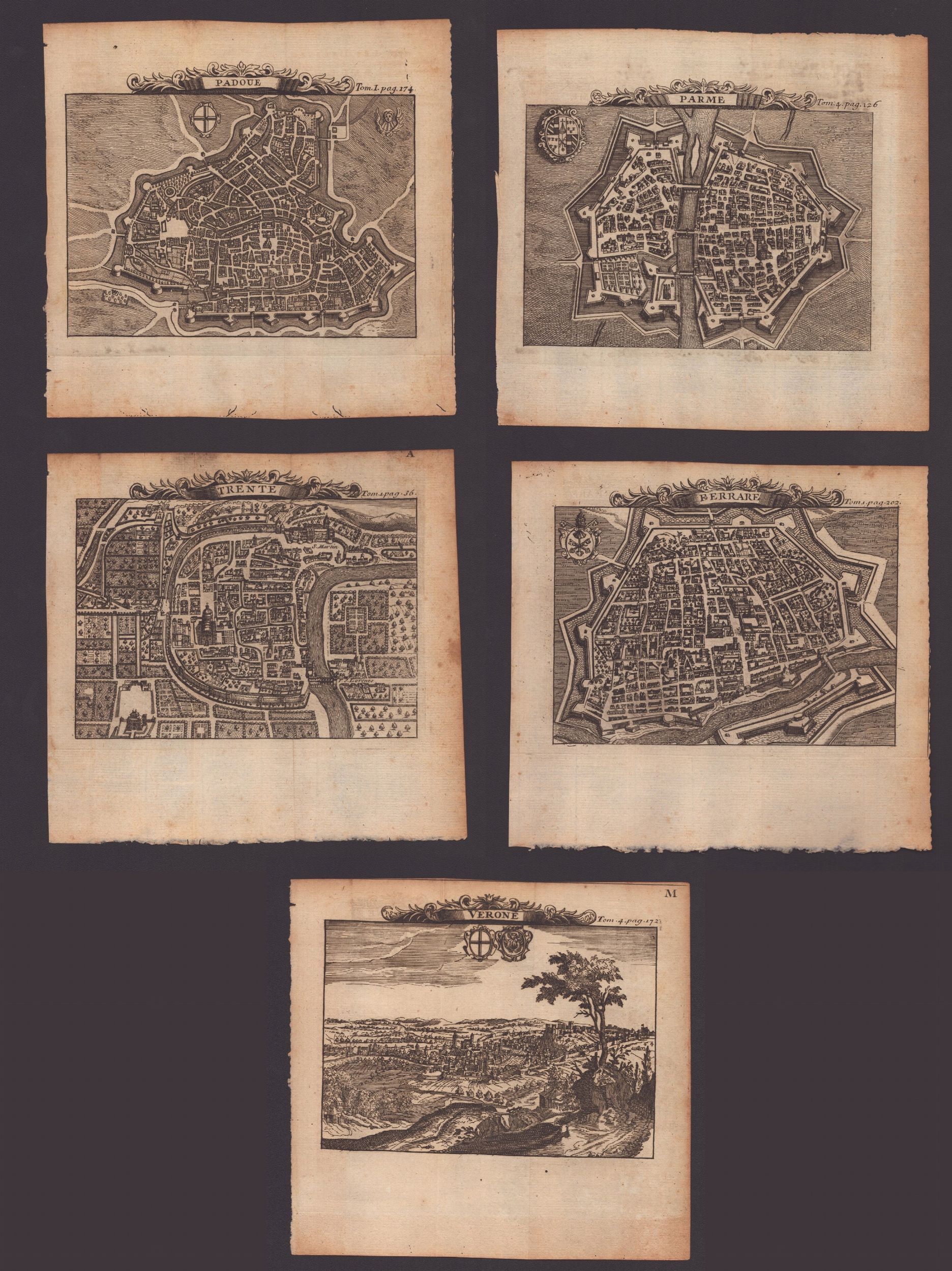 Acquaforte, 165 x 170 mm ca. (cad. foglio). Lotto di 5 piante delle città del Nord Italia: Trento, Verona, Parma, Ferrara e Padova, tratte da 'Les délices de l'Italie, contenant une description exacte du Païs, des principales villes, de toutes les Antiquitez...' Belle e ben inchiostrate impressioni su carta vergata sottile, con alcuni frammenti di filigrana. In ottimo stato di conservazione, salvo segni di brunitura e tracce delle consuete pieghe editoriali.