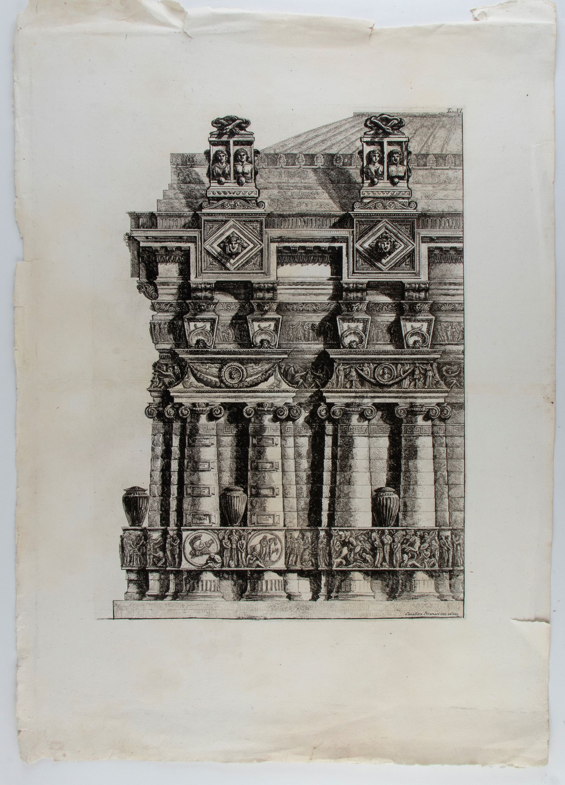 Acquaforte, 785 x 565 mm, tavola tratta da 'Osservazioni di Gio. Battista Piranesi sopra la lettre de Monsieur Mariette aux auteurs de la Gazette Littéraire de l'Europe'. Nitida e ben inchiostrata impressione su due fogli di carta vergata uniti, con doppia filigrana ('Bracciano' e una contromarca), foglio in ottimo stato salvo delle usure e strappi lungo i bordi.