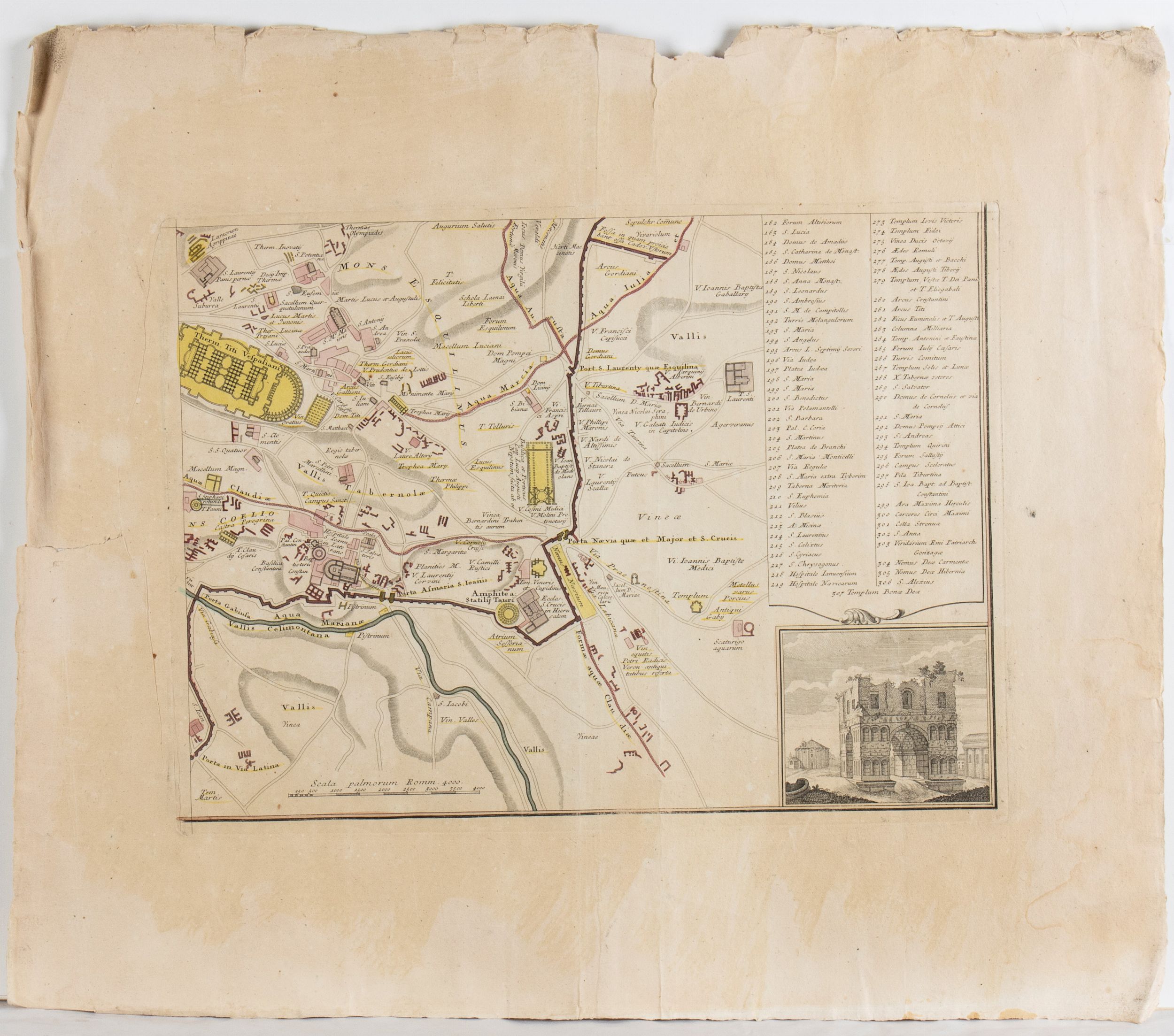 1755 Acquaforte, 365 x 495 mm ca. (cad. lastra); 585 x 675 mm ca. (cad. foglio). Mappa di Roma basata sulla versione di Noli del 1748, che rielabora una importante pianta della città di Leonardo Bufalino del 1551. Stampata da quattro lastre su quattro fogli separati, ancora da unire, con grandi margini. Carta vergata con filigrana. Coloritura coeva a mano. In generale, in ottimo stato di conservazione, salvo alcune pieghe e leggerissime bruniture.