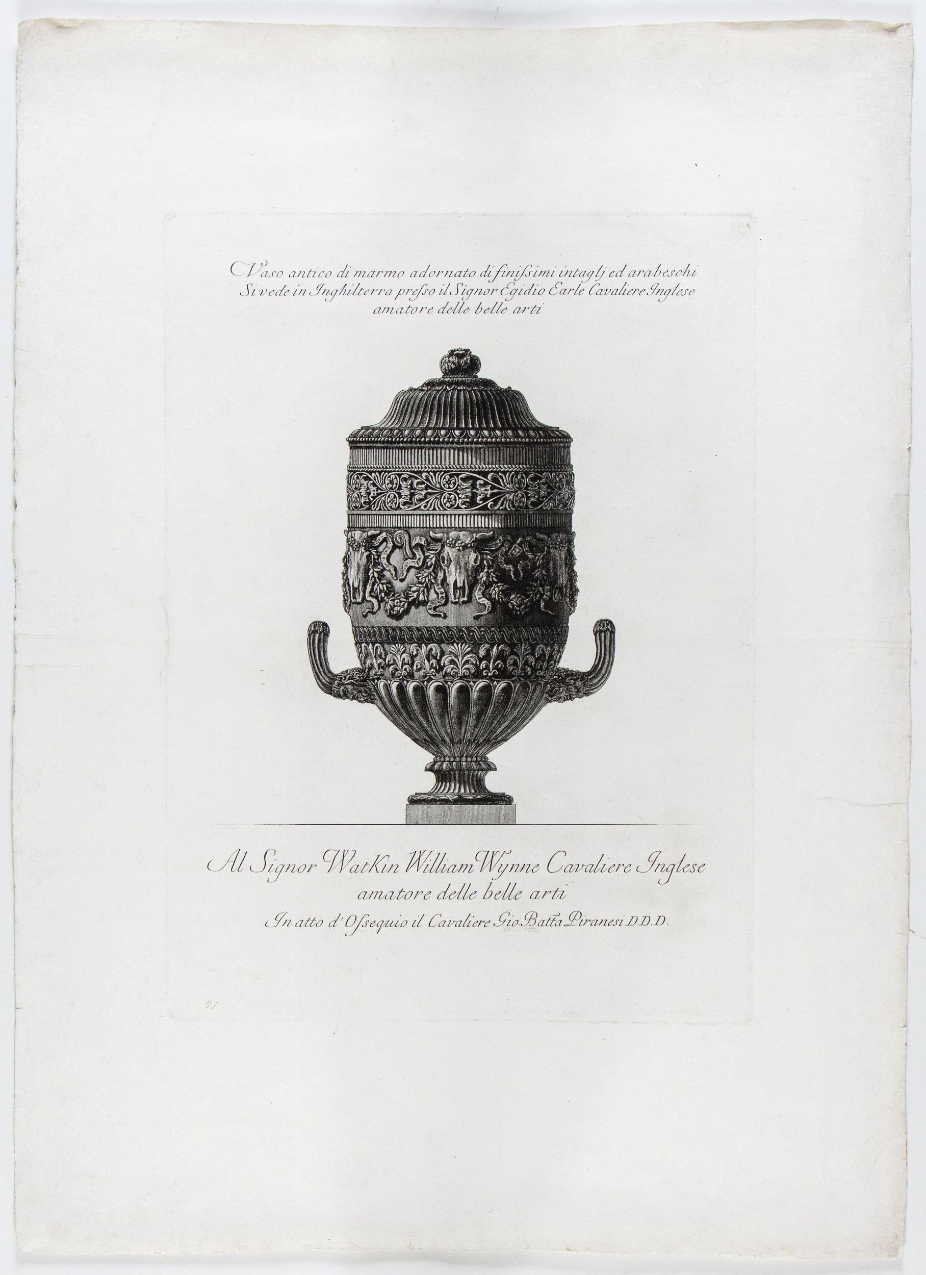Acquaforte, 533 x 389 mm (lastra), 815 x 590 mm (foglio). Focillon 627, Wilton-Ely 914. Dalla serie “Vasi, candelabri,cippi, sarcofagi, tripodi, lucerne ed ornamenti antichi disegnati ed incisi dal Cav. Gio. Batt. Piranesi pubblicati l'anno MDCCLXXIIX” stampata e pubblicata a Roma nel 1778. Bell'esemplare in tiratura romana coeva, stampato su carta vergata con filigrana (Giglio in doppio cerchio sormontato dalla lettera B). Ottimo stato di conservazione, salvo due strappi restaurati sui margini, leggeri difetti ai bordi e la consueta traccia di piega centrale orizzontale.