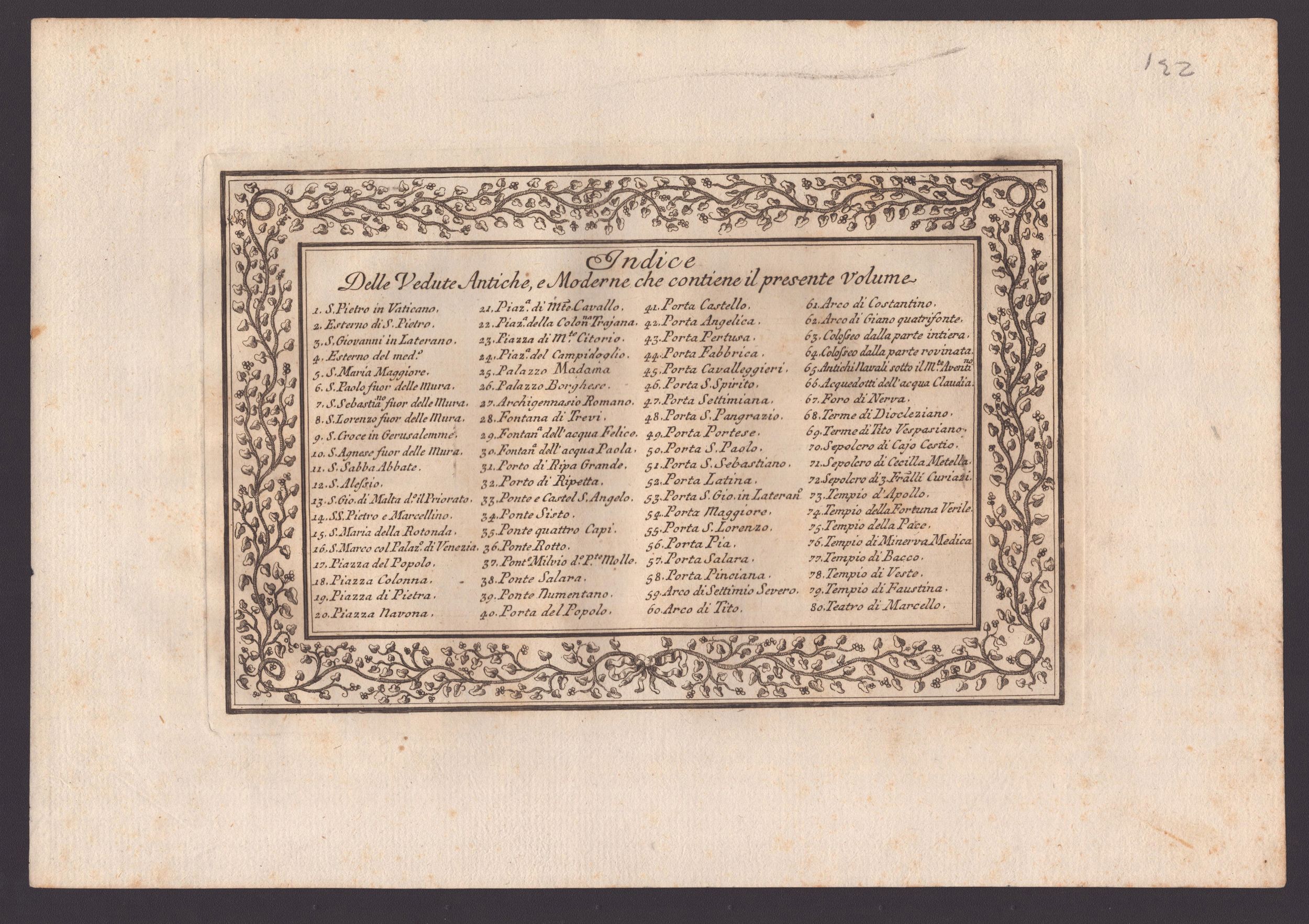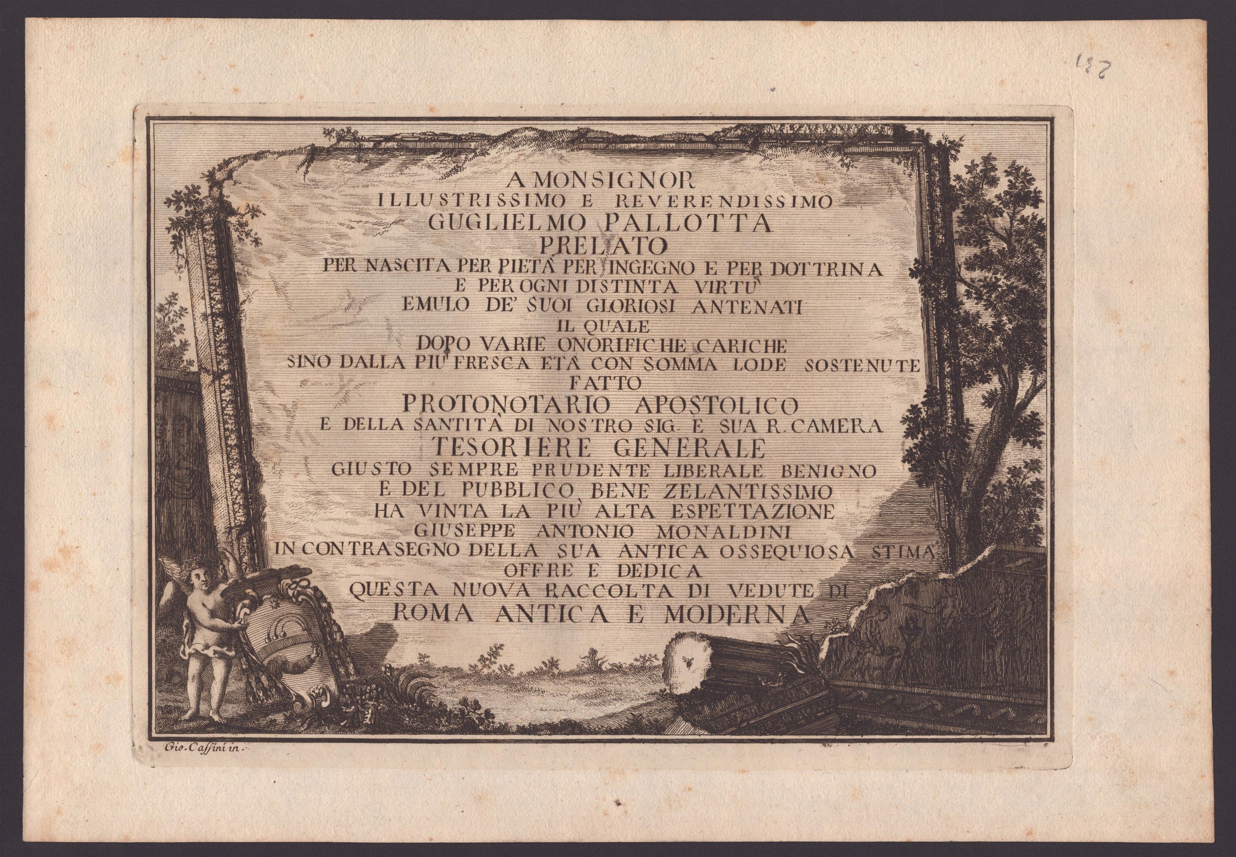 Lotto di 14 tavole: – 8 tavole tratte da 'Nuova raccolta delle migliori vedute antiche e moderne di Roma disegnate ed incise da Giovanni Cassini' (1779). Acquaforte, 270 x 388 mm (circa cad. foglio). Belle impressioni su carta vergata. In ottimo stato di conservazione, salvo qualche segno di fioritura. - 6 vedute di Dominique Montagu. Acquaforte, 178 x 278 mm circa (cad. foglio). Belle impressioni su carta vergata sottile. Buono stato di conservazione, salvo consuete pieghe editoriali e alcune bruniture.