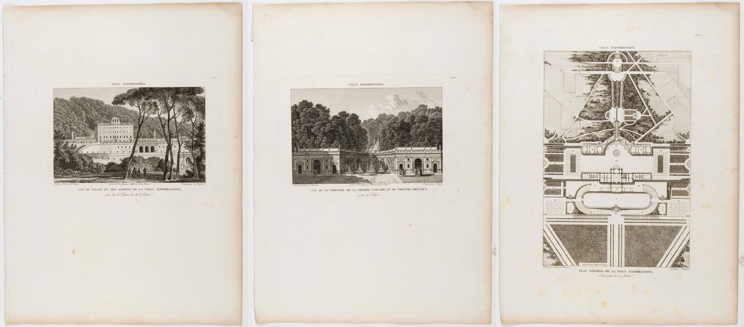 Lotto di 3 tavole raffiguranti Villa Aldobrandini a Frascati. Bulino e acquaforte, 480 x 355 mm (cad. foglio). Incluse 2 tavole con testo esplicativo. Belle impressioni su carta vergata. In ottimo stato, salvo leggere bruniture lungo i bordi.