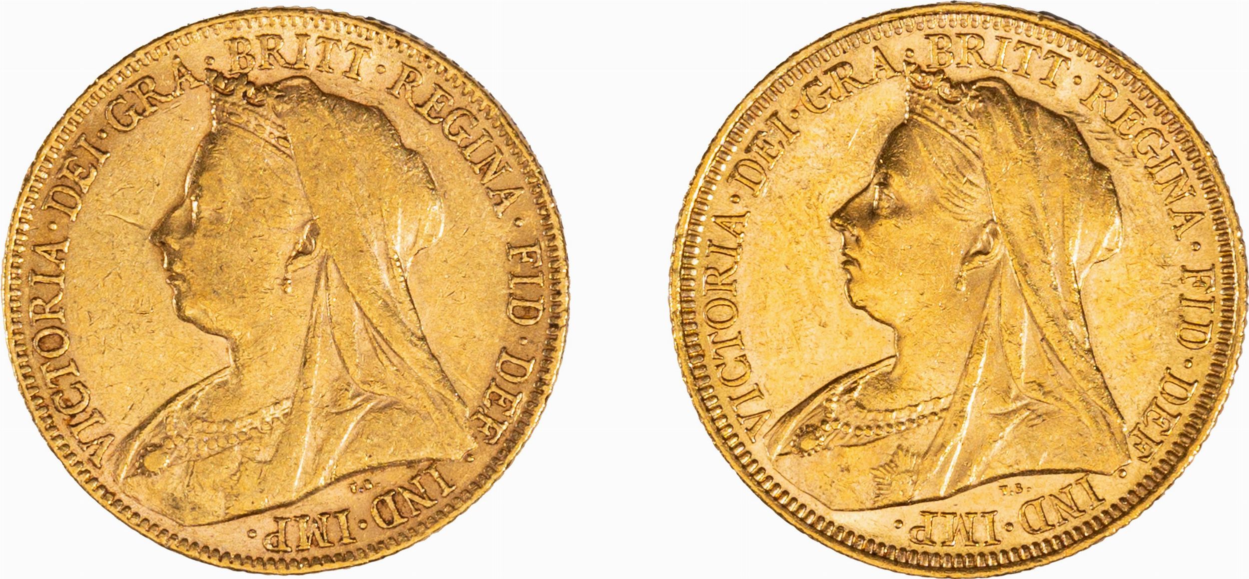 1894 e 1900 Londra, M, S ? e Londra, P, M, S ?. Entrambe BB Rarità C - 7,988 g - AV titolo 916,66