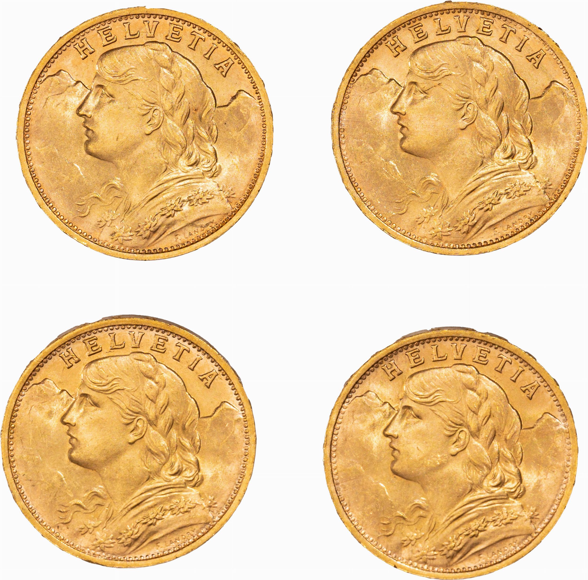 Svizzera, CONFEDERAZIONE (dal 1848) : Lotto di quattro esemplari del 20 franchi  - Asta Numismatica - Associazione Nazionale - Case d'Asta italiane