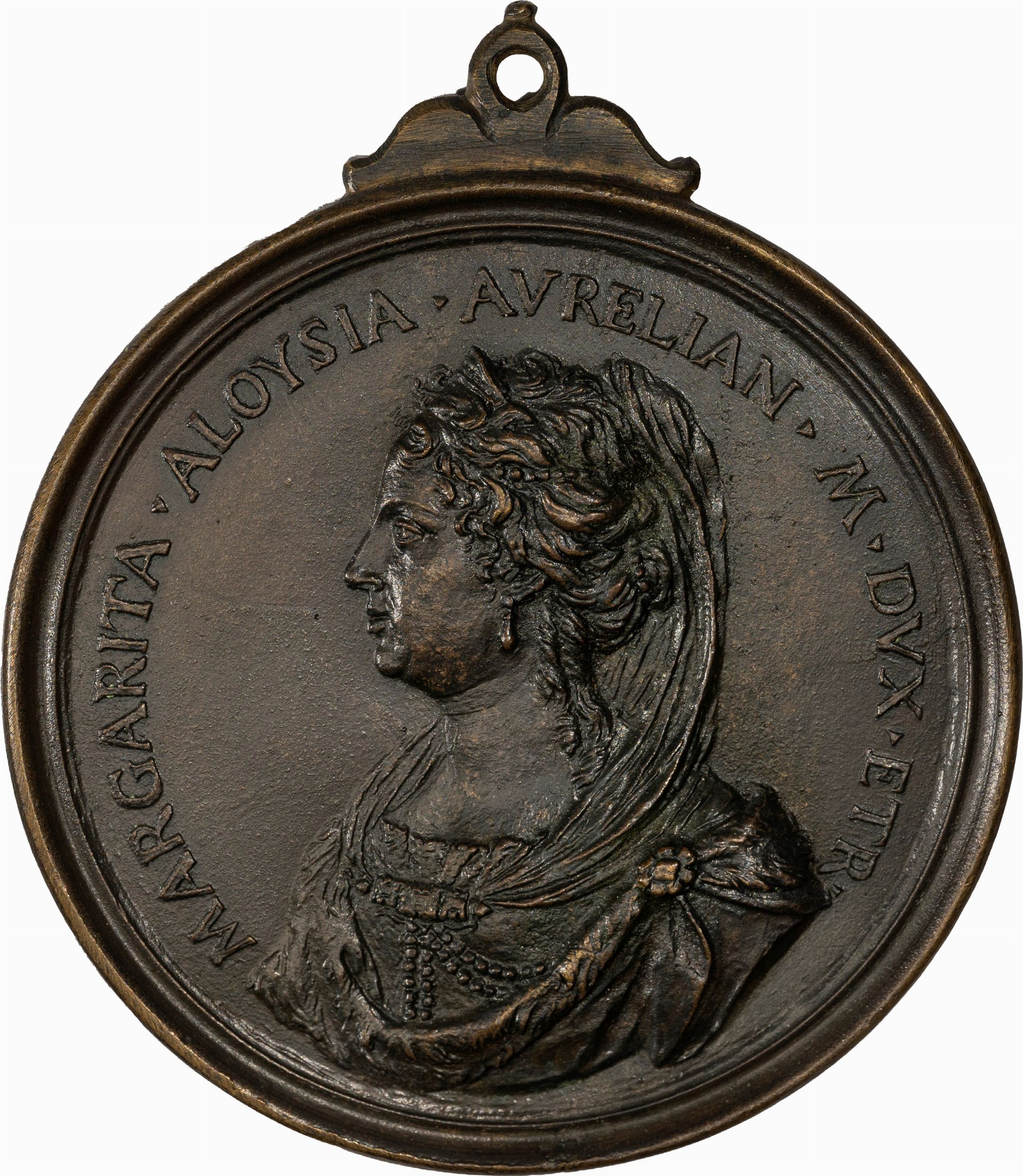 1740 Dritto: MARGARITA • ALOYSIA • AVRELIAN • M • DVX ETR •, busto velato a sx con diadema e mantello Verso: CELESTIS _ ORIGO *, fiore irrigato dalla rugiada caduta dalle stelle. Rarità / - mm 86,0- AE Bronzo / Fusione + Bordo Dorato. BB+ Il ricavato delle opere donate da Maria Pia Bossi verrà devoluto a sostegno delle attività di ricerca di Fondazione Humanitas per la Ricerca ETS. Finarte, estranea all'operazione benefica, in relazione al presente lotto percepisce regolarmente dalle parti diritti e commissioni d'asta.