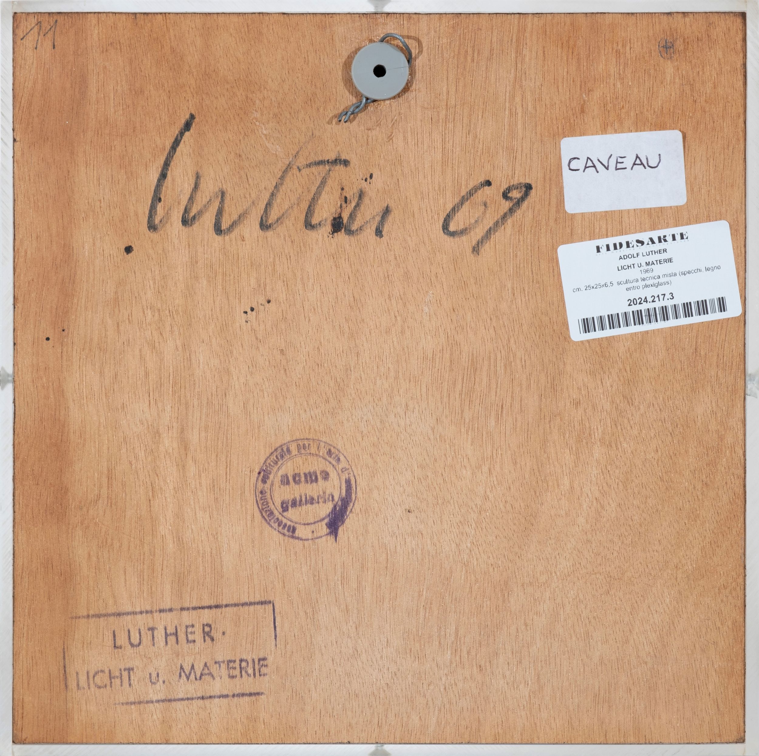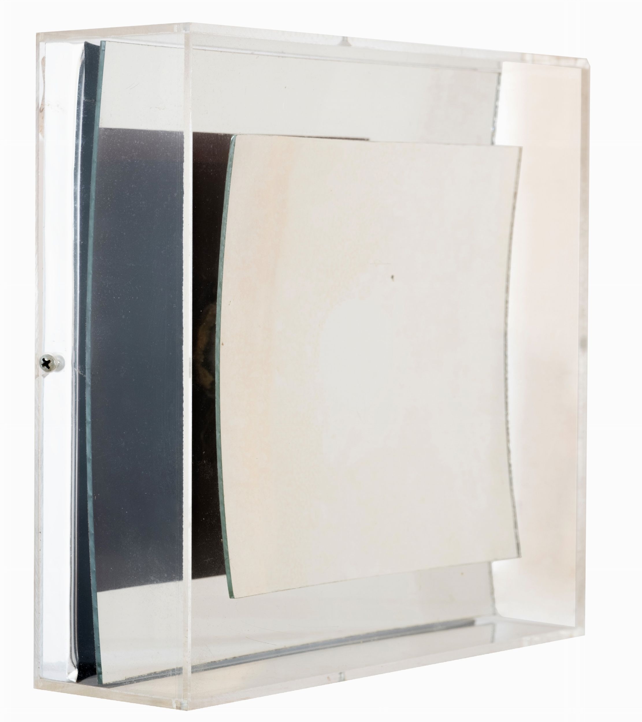 scultura tecnica mista (specchi, legno entro teca in plexiglass), cm. 25x25x6,5