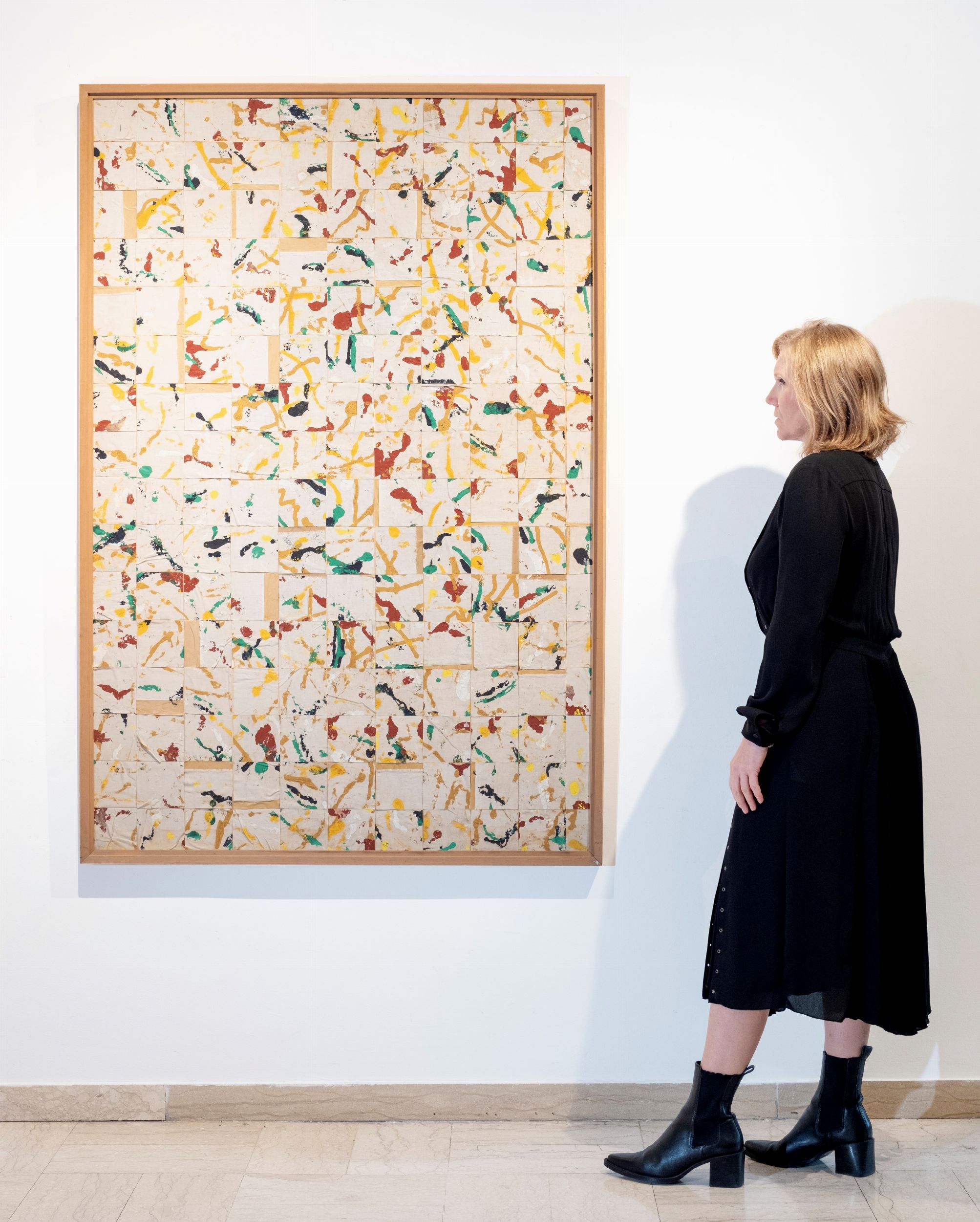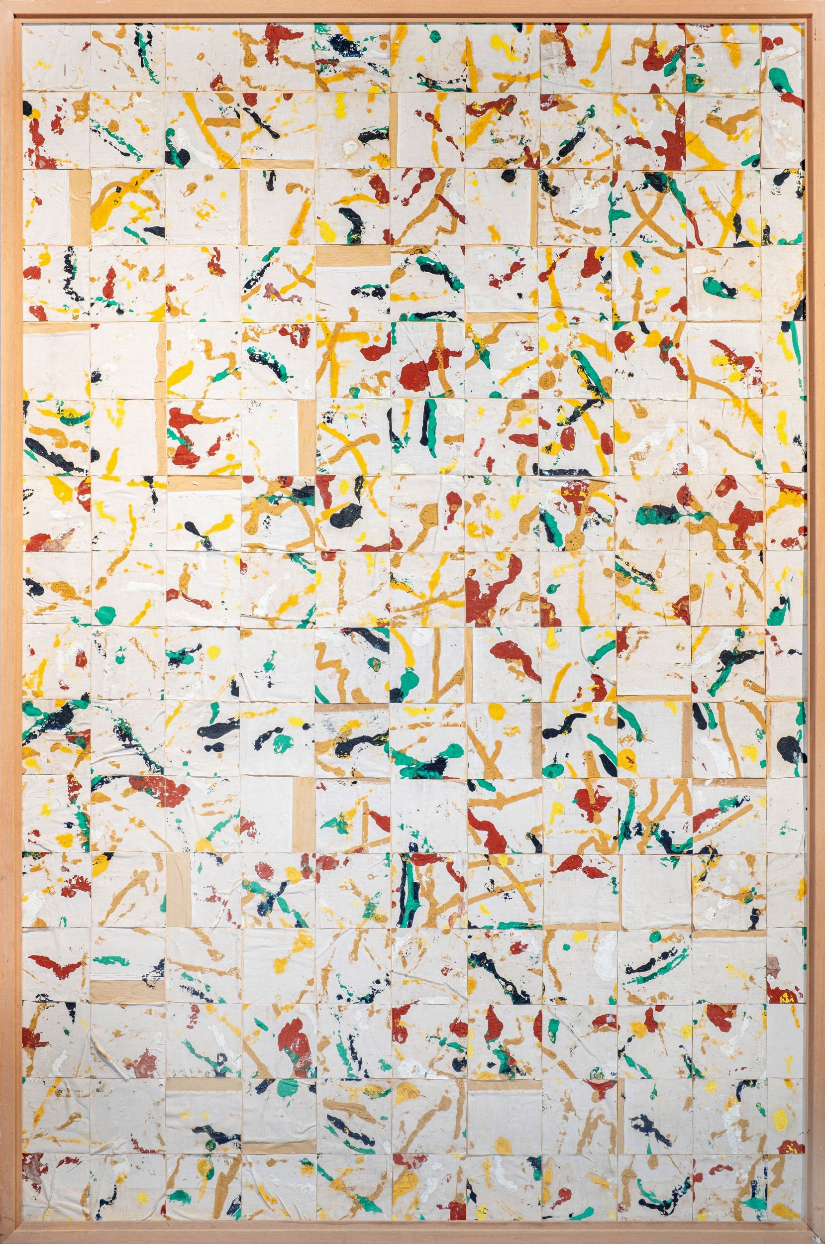 acrilici su ritagli di tela (collage) su tavola, cm. 162x108