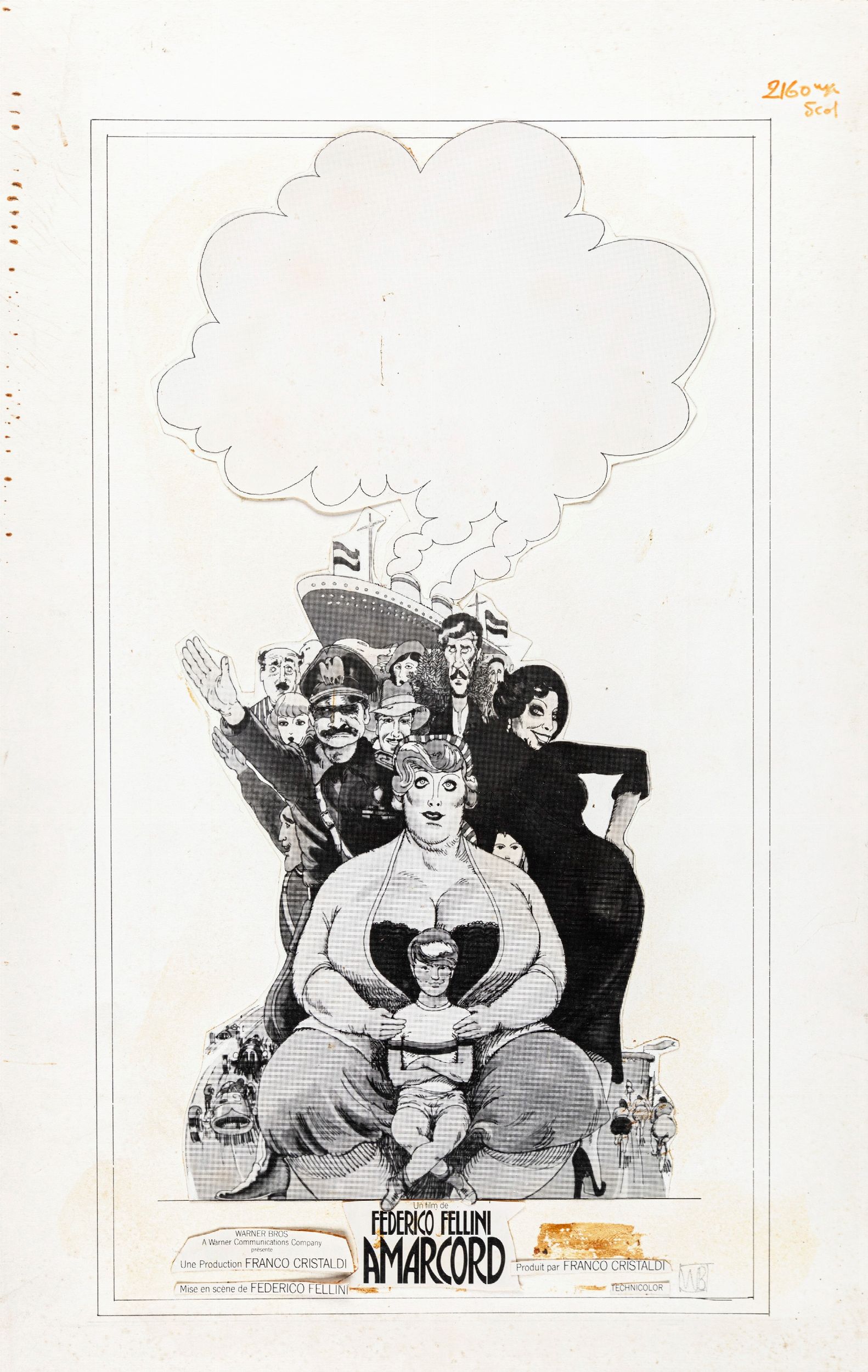 1973 Bozzetto originale realizzato per il flano francese del film 'Amarcord', diretto da Federico Fellini con Magali Noel e Ciccio Ingrassia nel 1973.