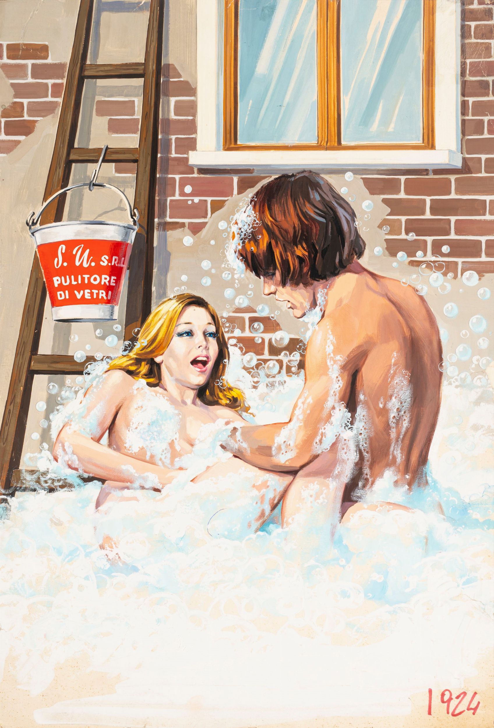 tempera su cartoncino, 42,5 x 62 cm 1974 Bozzetto originale realizzato per la locandina ufficiale del film 'Confessioni di un pulitore di finestre', diretto da Val Guestl con Robin Askwith e Linda Hayden nel 1974. Piccoli strappi, fori e una mancanza ai margini.