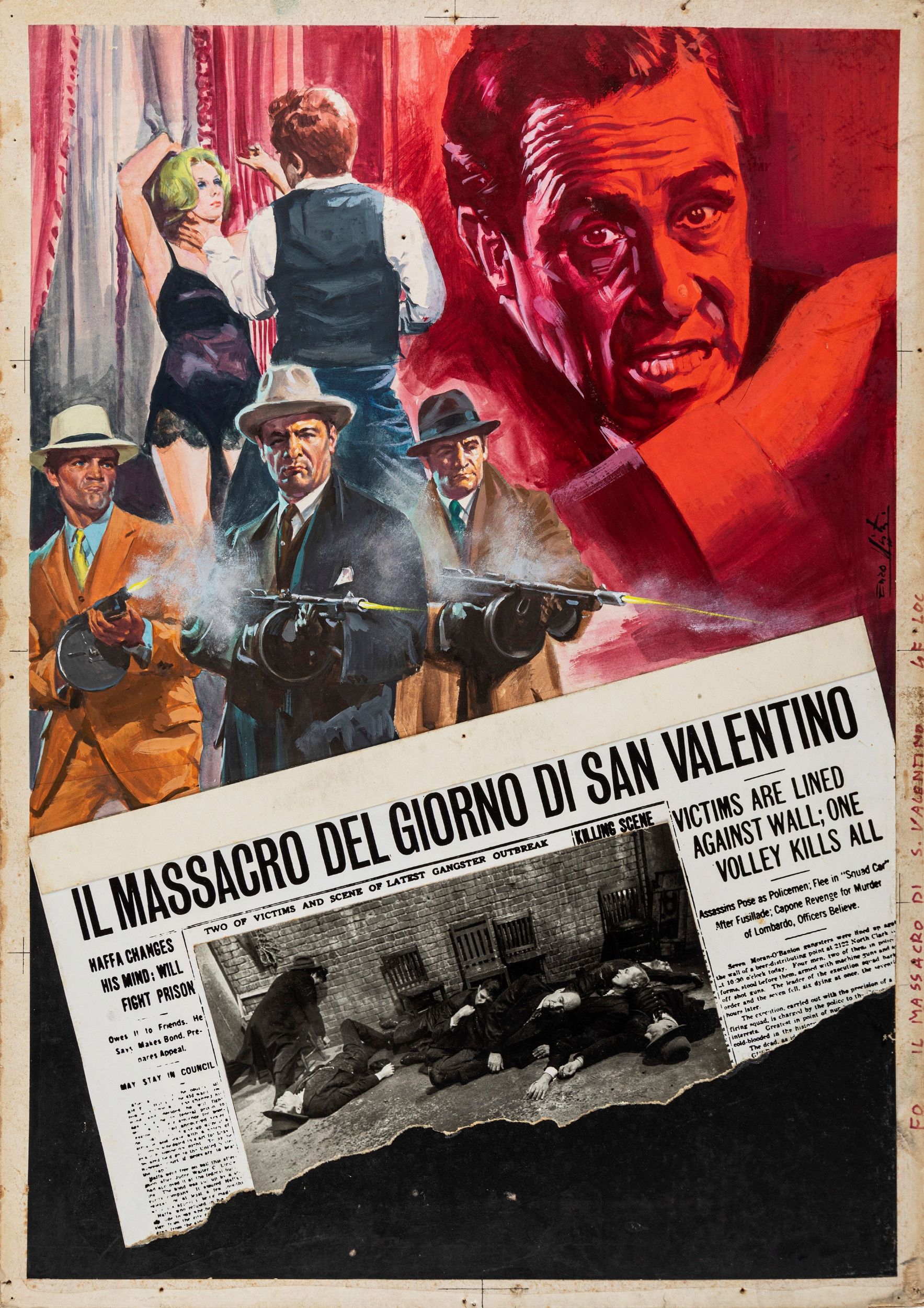 tempera e collage su cartone, 43,5 x 61,5 cm 1967 Bozzetto originale realizzato da Enzo Nistri per la locandina ufficiale del film 'Il massacro del giorno di San Valentino' diretto da Roger Corman con Jack Nicholson e Jason Robards nel 1967. Fori di affissione ai margini. Firmato.