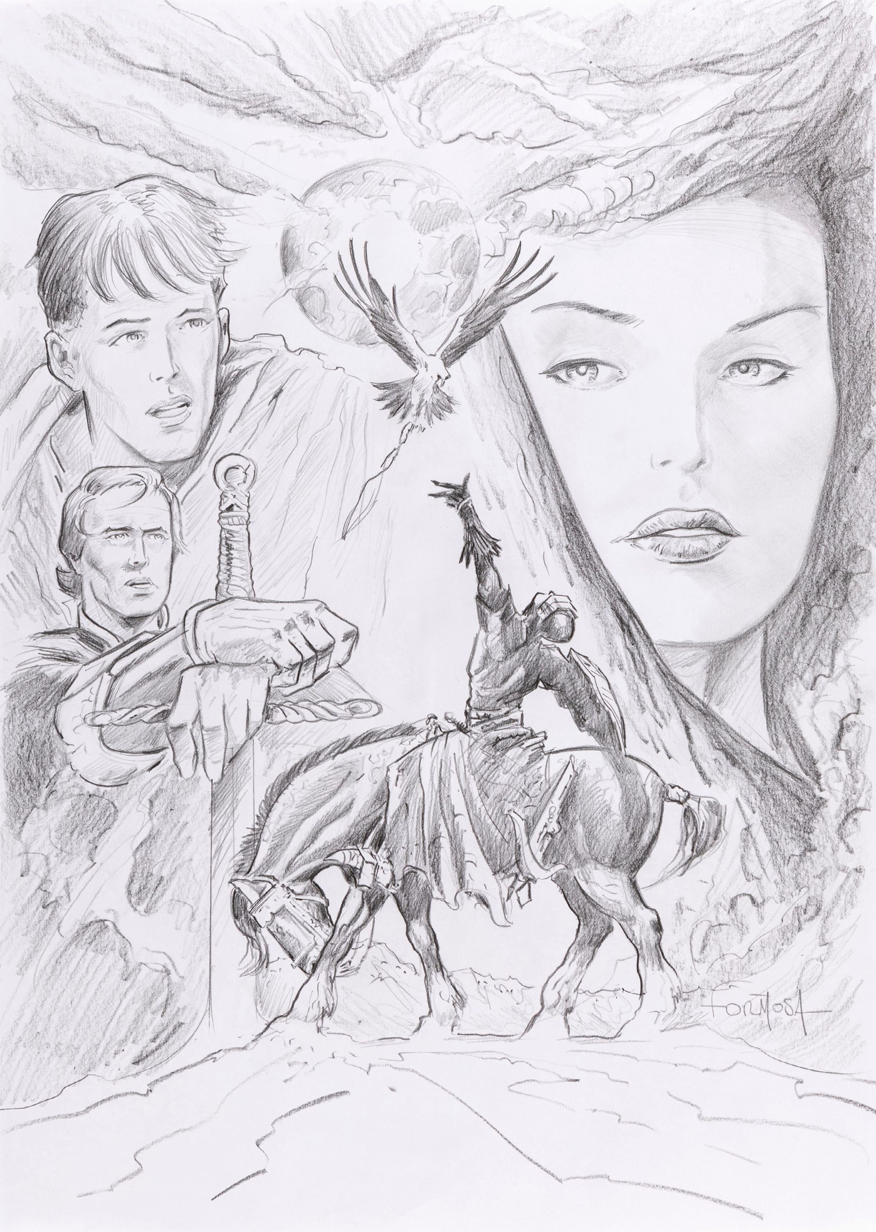 1985 Bozzetto preliminare realizzato da Formosa per la locandina ufficiale del film 'Ladyhawke', diretto da Richard Donner con Rutger Hauer, Michelle Pfeiffer e Matthew Broderick nel 1985. Firmato.