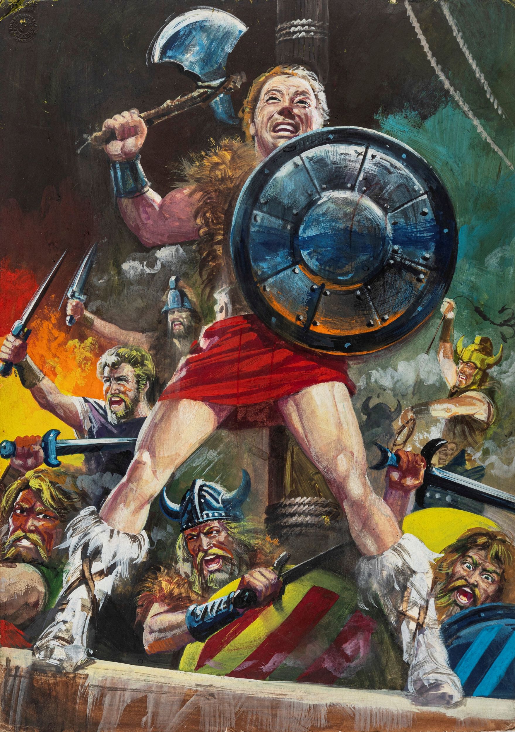 tempera su cartone, 36,5 x 51 cm 1961 Bozzetto originale realizzato per la locandina ufficiale del film 'L'ultimo dei Vichinghi', diretto da Giacomo Gentilomo con Cameron Mitchell e Edmund Purdom nel 1961. Lievi pieghe agli angoli e piccola ammaccatura al margine destro.