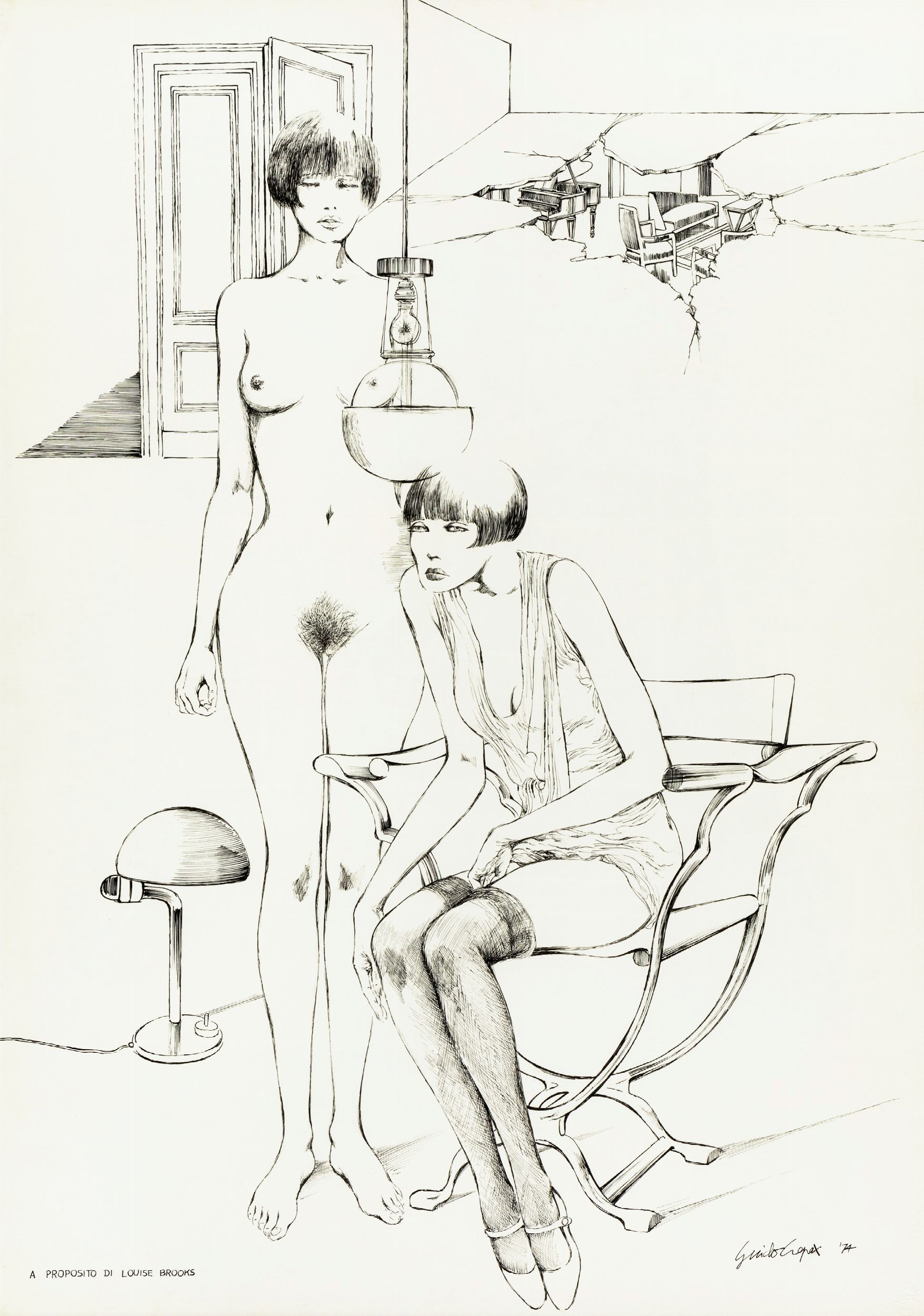 matita e china su cartone, 51,5 x 73 cm 1974 Illustrazione originale realizzata da Crepax per il volume 'A proposito di Valentina', pubblicata da Quadragono Edizioni nel 1975. Sottotitolo dell'opera 'Imitazioni di Louise Brooks', Crepax gioca mettendo a confronto la sua Valentina e la sua musa terrena. Firmata e datata.