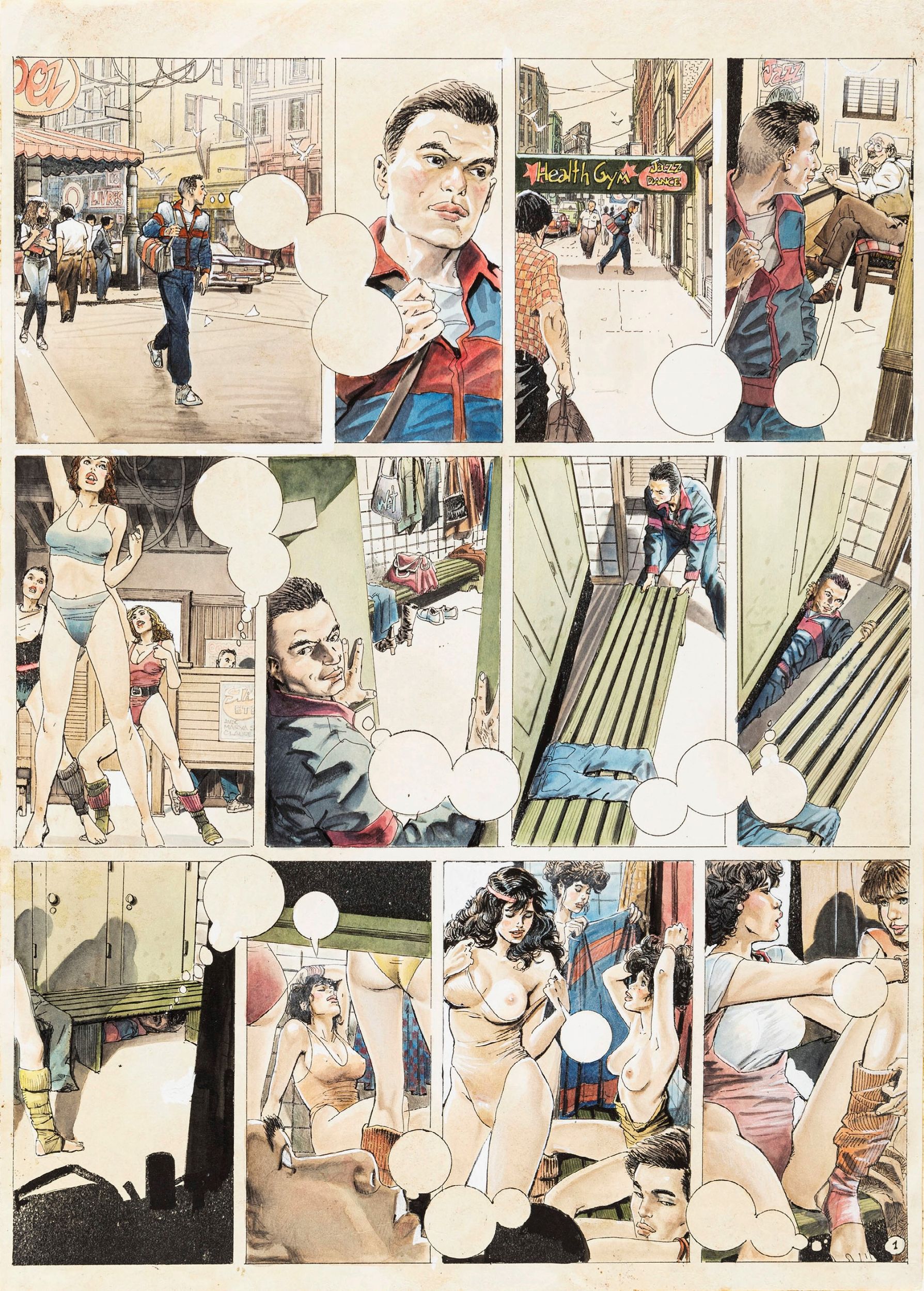 matita, china, biacca, e tempera su fotocopia, 30 x 42 cm anni 80 Tavola originale realizzata da Altuna per la pag. 1 della avventura erotica intitolata 'En forma', pubblicata per la prima volta sulle pagine di Playboy negli anni '80 e successivamente ristampata nel volume 'El Mirón 2' dalle Ediciones de la Urraca nel 1996.