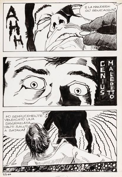 matita e china su cartoncino, 22,5 x 32,5 cm 1970 Tavola originale realizzata da Manara per 'Al profumo di Lillà', edita su Genius n. 22 a pag. 66 dalla Furio Viano Editore nel 1970. L'opera prima di un giovanissimo Manara che approda al mondo del fumetto con questo erotico-poliziesco nato come emulo di Diabolik.