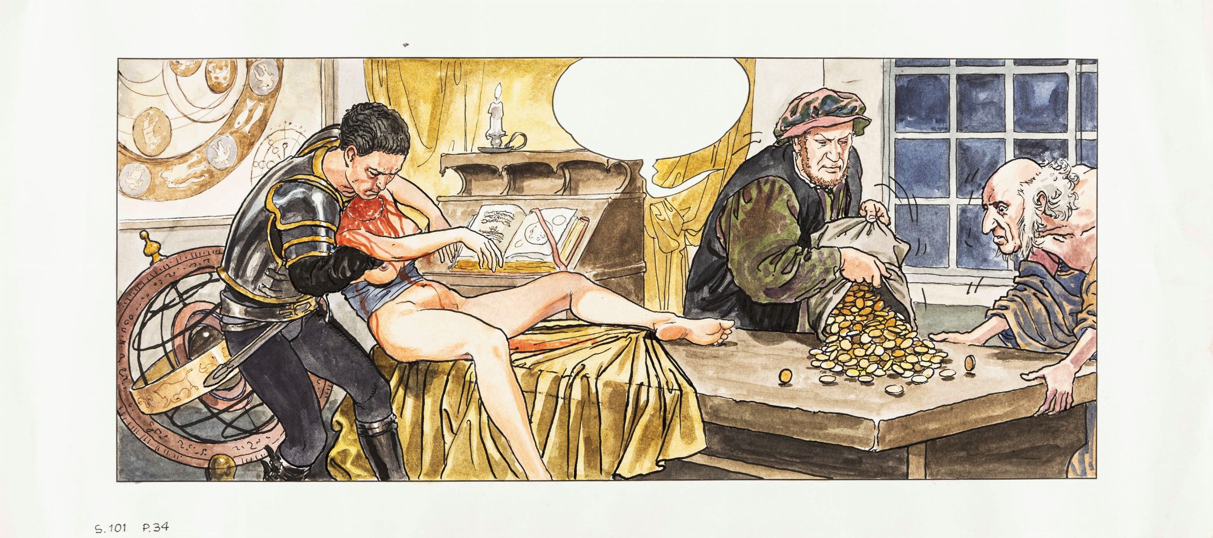 matita, china e acquerello su cartoncino, 57 x 25,5 cm 2011 Striscia originale realizzata da Manara per 'I Borgia: Le fiamme del rogo', edita a pag. 34 del vol. 3 da Mondadori nel 2011. Sui testi di Alejandro Jodorowsky, Manara affresca una saga dalla grande componente erotico-shakspeariana narrando, tramite aneddoti e leggende, gli intrighi, le passioni e i più perversi segreti della famiglia Borgia e di papa Alessandro VI. Lievi pieghe al margine destro.