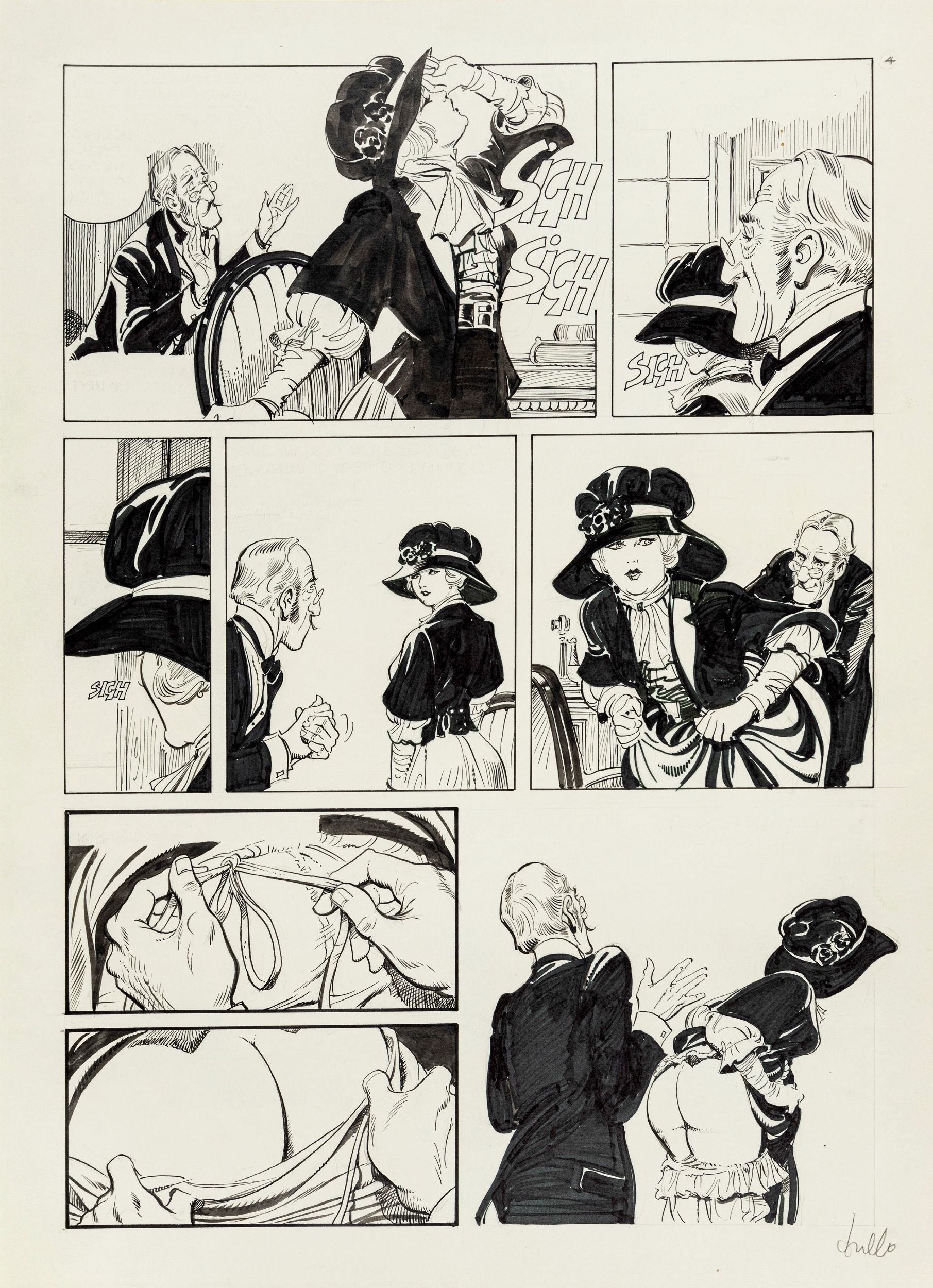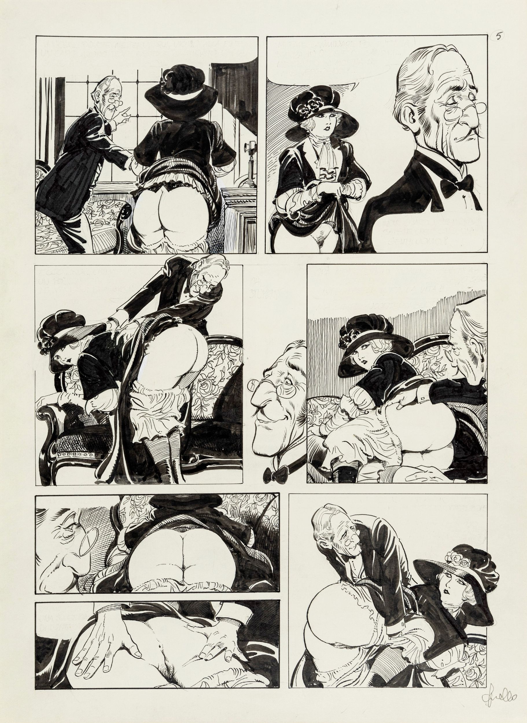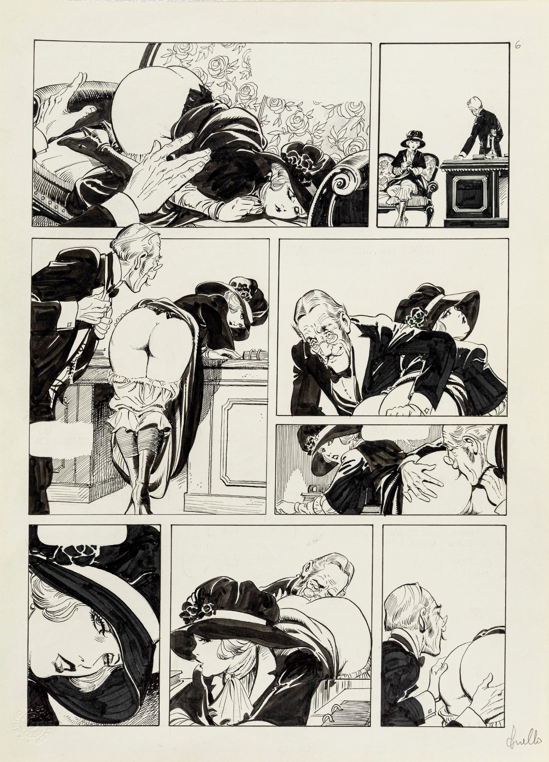 matita e china su cartoncino, 29,5 x 40,5 cm ciascuno 1987 Storia completa composta da 7 tavole originali realizzate da Frollo per 'La storia di Rose', avventura erotica della sua Mona edita nel volume Malicieusement Femme dalla Glamour International nel 1987. Pubblicata in Francia con il titolo 'L'histoire de Rosy', segna la consacrazione di Frollo nell'Olimpo del fumetto erotico d'autore a livello mondiale. Insieme a 'I signori della notte' questa è l'unica storia di Mona Street che Frollo decise di inchiostrare totalmente, dandoci così uno scorcio della sua incredibile capacità tecnica e regalandoci un vero e proprio capolavoro. Firmata in ogni pagina.