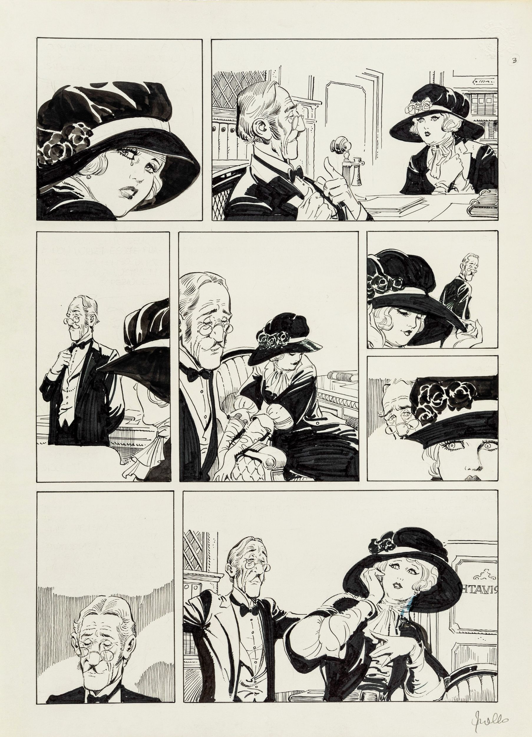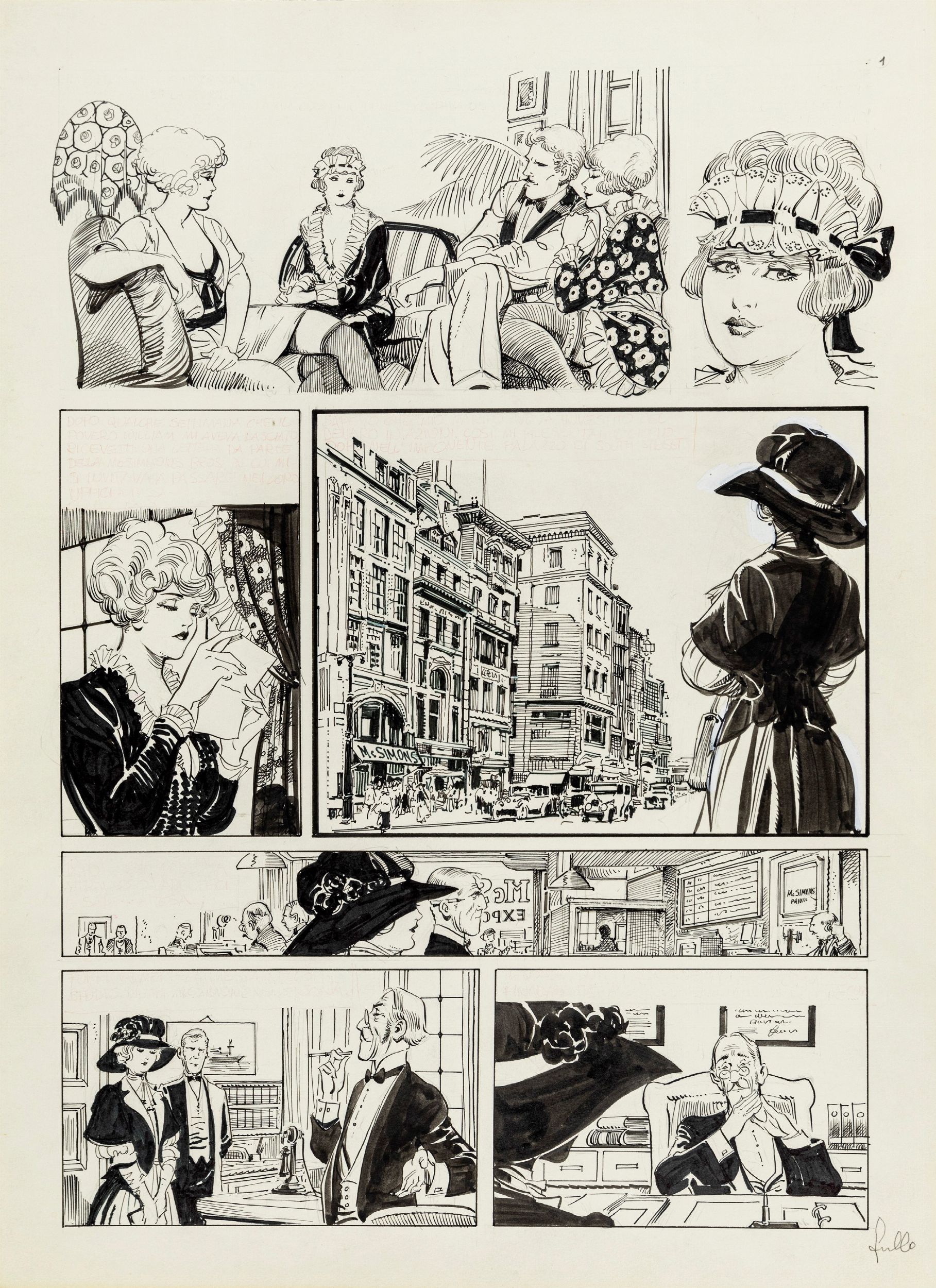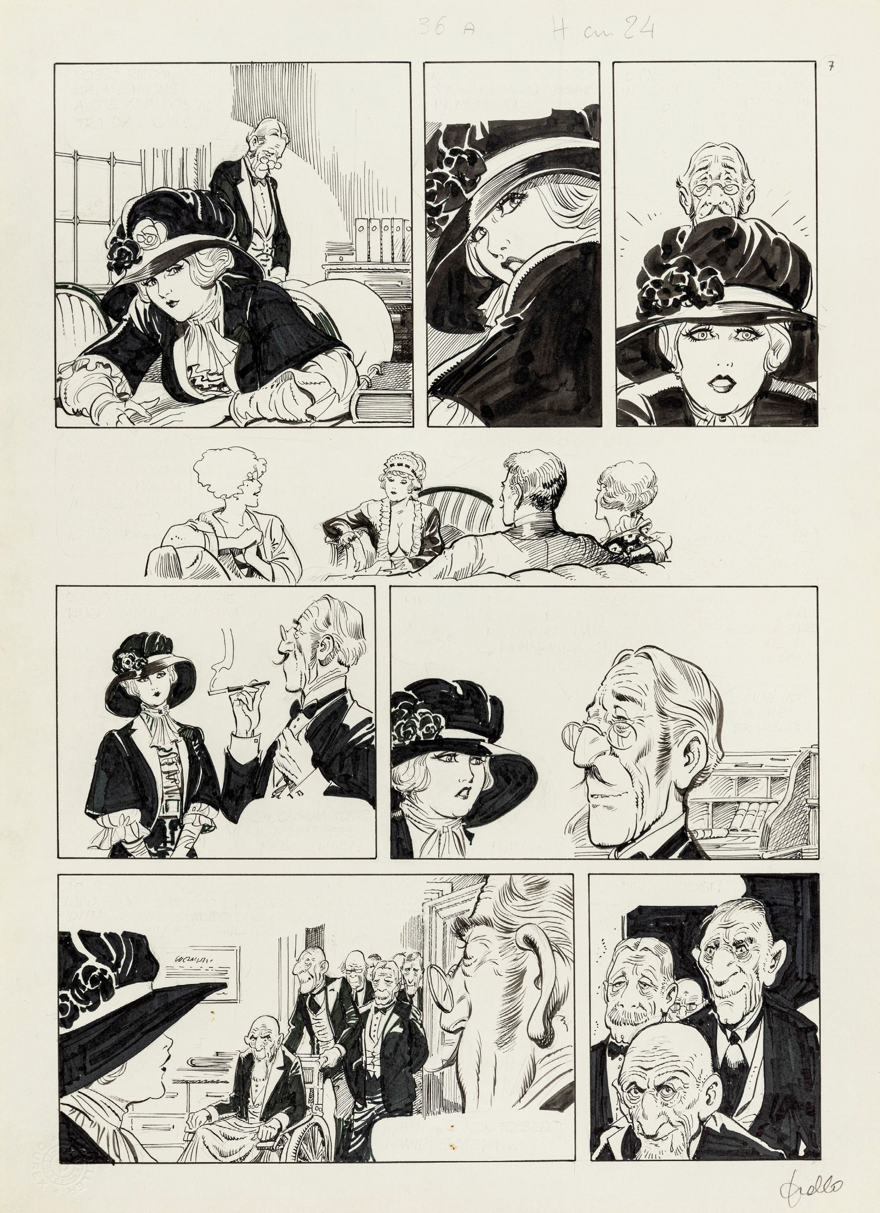 matita e china su cartoncino, 29,5 x 40,5 cm ciascuno 1987 Storia completa composta da 7 tavole originali realizzate da Frollo per 'La storia di Rose', avventura erotica della sua Mona edita nel volume Malicieusement Femme dalla Glamour International nel 1987. Pubblicata in Francia con il titolo 'L'histoire de Rosy', segna la consacrazione di Frollo nell'Olimpo del fumetto erotico d'autore a livello mondiale. Insieme a 'I signori della notte' questa è l'unica storia di Mona Street che Frollo decise di inchiostrare totalmente, dandoci così uno scorcio della sua incredibile capacità tecnica e regalandoci un vero e proprio capolavoro. Firmata in ogni pagina.