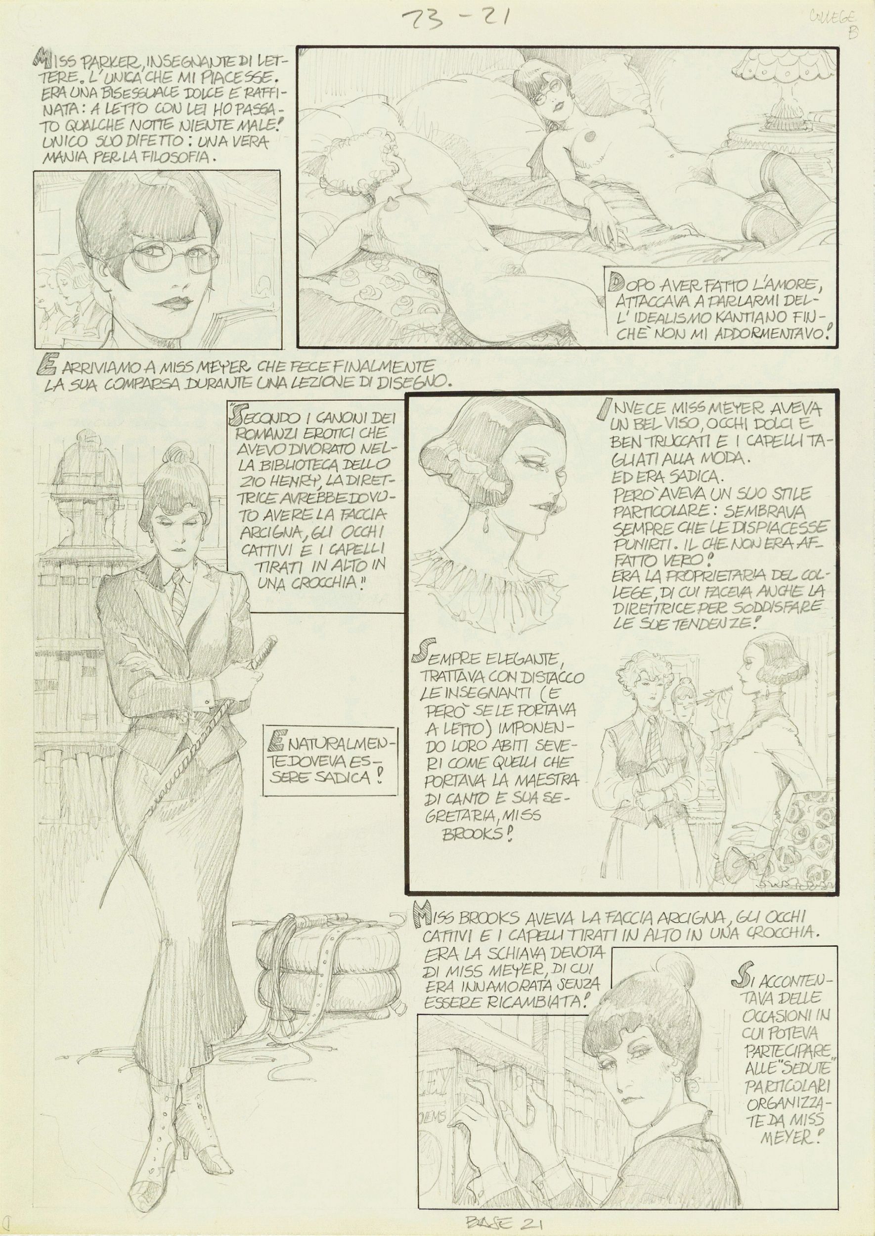 1988 Tavola originale realizzata da Frollo per 'College', avventura erotica della sua Mona edita a pag. 3 nel volume Mona Street 1: The Secret Books of Glamour dalla Glamour International nel 1988. Pubblicata in Francia nello stesso anno con il titolo 'Le pensionnat', segna la consacrazione di Frollo nell'Olimpo del fumetto erotico d'autore a livello mondiale. Siamo nella Boston degli anni Venti del Novecento, Mona Street è una scaltra fanciulla da poco uscita dal college, curve morbide candidamente ostentate, un viso innocente dallo sguardo ironico e un sorriso appena accennato sulle labbra. Mona Street è un normale nome inglese, ma se si pensa che Leone Frollo è veneziano allora il giocoso equivoco verbale diventa intuitivo. L'ammiccamento malizioso c'è già nel nome, dunque, ma tutte le storie di Mona Street sono sottese di ammorbante erotismo, ingegnosamente narrate dall'autore che, con un tratto morbido e voluttuoso a matita o china, ha tracciato un personaggio ben diverso dalle altre 'eroine del fumetto' quasi sempre succubi dell'uomo: Mona ha una personalità da falsa ingenua che si prende gioco di tutti, diventando a volte vindice del proprio sesso.