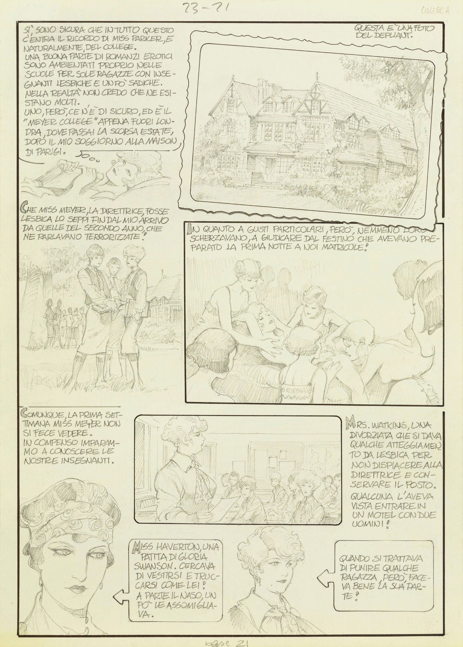 1988 Tavola originale realizzata da Frollo per 'College', avventura erotica della sua Mona edita a pag. 2 nel volume Mona Street 1: The Secret Books of Glamour dalla Glamour International nel 1988. Pubblicata in Francia nello stesso anno con il titolo 'Le pensionnat', segna la consacrazione di Frollo nell'Olimpo del fumetto erotico d'autore a livello mondiale. Siamo nella Boston degli anni Venti del Novecento, Mona Street è una scaltra fanciulla da poco uscita dal college, curve morbide candidamente ostentate, un viso innocente dallo sguardo ironico e un sorriso appena accennato sulle labbra. Mona Street è un normale nome inglese, ma se si pensa che Leone Frollo è veneziano allora il giocoso equivoco verbale diventa intuitivo. L'ammiccamento malizioso c'è già nel nome, dunque, ma tutte le storie di Mona Street sono sottese di ammorbante erotismo, ingegnosamente narrate dall'autore che, con un tratto morbido e voluttuoso a matita o china, ha tracciato un personaggio ben diverso dalle altre 'eroine del fumetto' quasi sempre succubi dell'uomo: Mona ha una personalità da falsa ingenua che si prende gioco di tutti, diventando a volte vindice del proprio sesso.