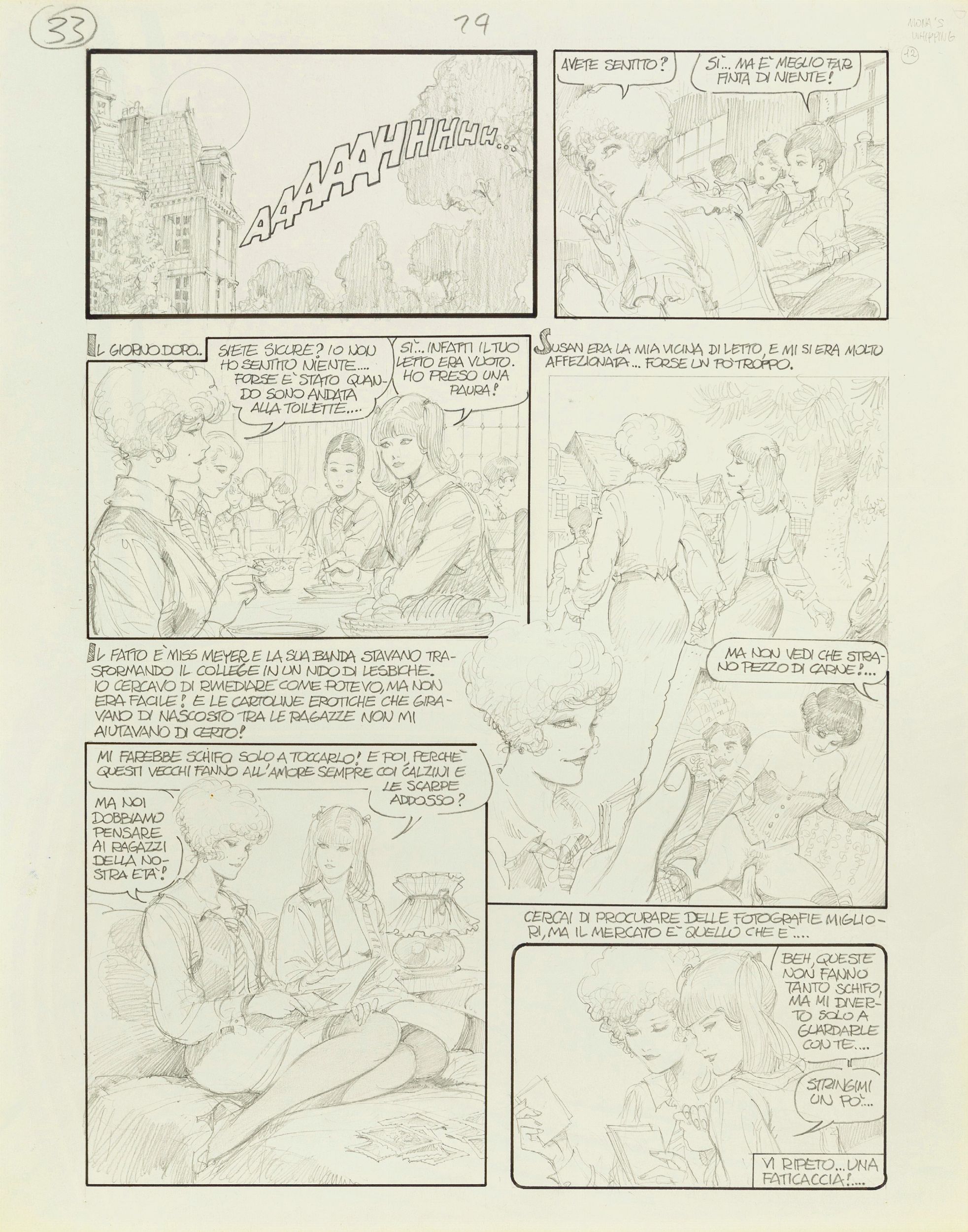 1988 Tavola originale realizzata da Frollo per 'Mona's whipping', avventura erotica della sua Mona edita a pag. 12 nel volume Mona Street 1: The Secret Books of Glamour dalla Glamour International nel 1988. Pubblicata in Francia nello stesso anno con il titolo 'Mona's whipping', segna la consacrazione di Frollo nell'Olimpo del fumetto erotico d'autore a livello mondiale. Siamo nella Boston degli anni Venti del Novecento, Mona Street è una scaltra fanciulla da poco uscita dal college, curve morbide candidamente ostentate, un viso innocente dallo sguardo ironico e un sorriso appena accennato sulle labbra. Mona Street è un normale nome inglese, ma se si pensa che Leone Frollo è veneziano allora il giocoso equivoco verbale diventa intuitivo. L'ammiccamento malizioso c'è già nel nome, dunque, ma tutte le storie di Mona Street sono sottese di ammorbante erotismo, ingegnosamente narrate dall'autore che, con un tratto morbido e voluttuoso a matita o china, ha tracciato un personaggio ben diverso dalle altre 'eroine del fumetto' quasi sempre succubi dell'uomo: Mona ha una personalità da falsa ingenua che si prende gioco di tutti, diventando a volte vindice del proprio sesso.