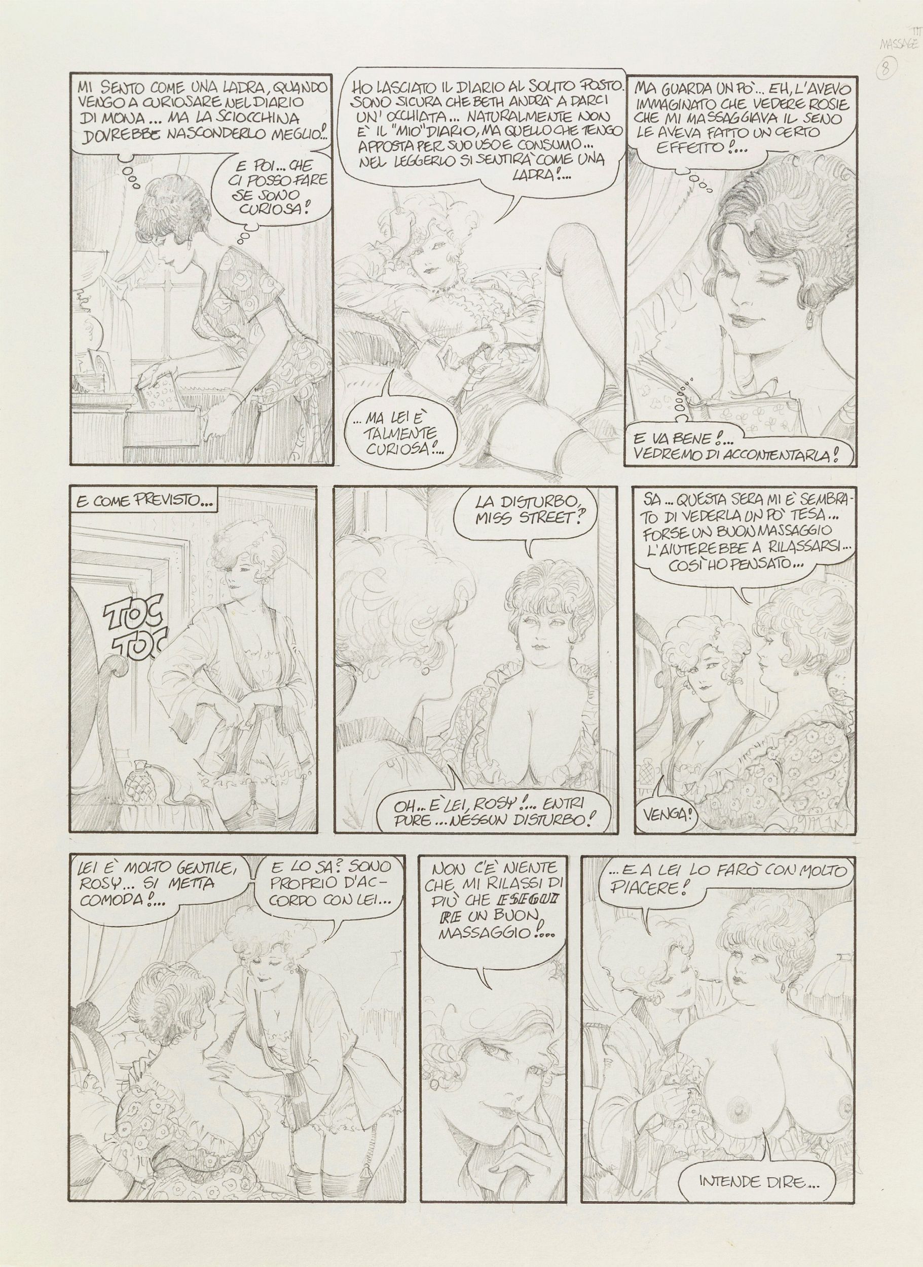 1991 Tavola originale realizzata da Frollo per 'Tith massage', avventura erotica della sua Mona edita a pag. 8 nel volume Mona Street 2: The Secret Books of Glamour dalla Glamour International nel 1991. Pubblicata in Francia nello stesso anno con il titolo 'Tits massages', segna la consacrazione di Frollo nell'Olimpo del fumetto erotico d'autore a livello mondiale. Siamo nella Boston degli anni Venti del Novecento, Mona Street è una scaltra fanciulla da poco uscita dal college, curve morbide candidamente ostentate, un viso innocente dallo sguardo ironico e un sorriso appena accennato sulle labbra. Mona Street è un normale nome inglese, ma se si pensa che Leone Frollo è veneziano allora il giocoso equivoco verbale diventa intuitivo. L'ammiccamento malizioso c'è già nel nome, dunque, ma tutte le storie di Mona Street sono sottese di ammorbante erotismo, ingegnosamente narrate dall'autore che, con un tratto morbido e voluttuoso a matita o china, ha tracciato un personaggio ben diverso dalle altre 'eroine del fumetto' quasi sempre succubi dell'uomo: Mona ha una personalità da falsa ingenua che si prende gioco di tutti, diventando a volte vindice del proprio sesso.