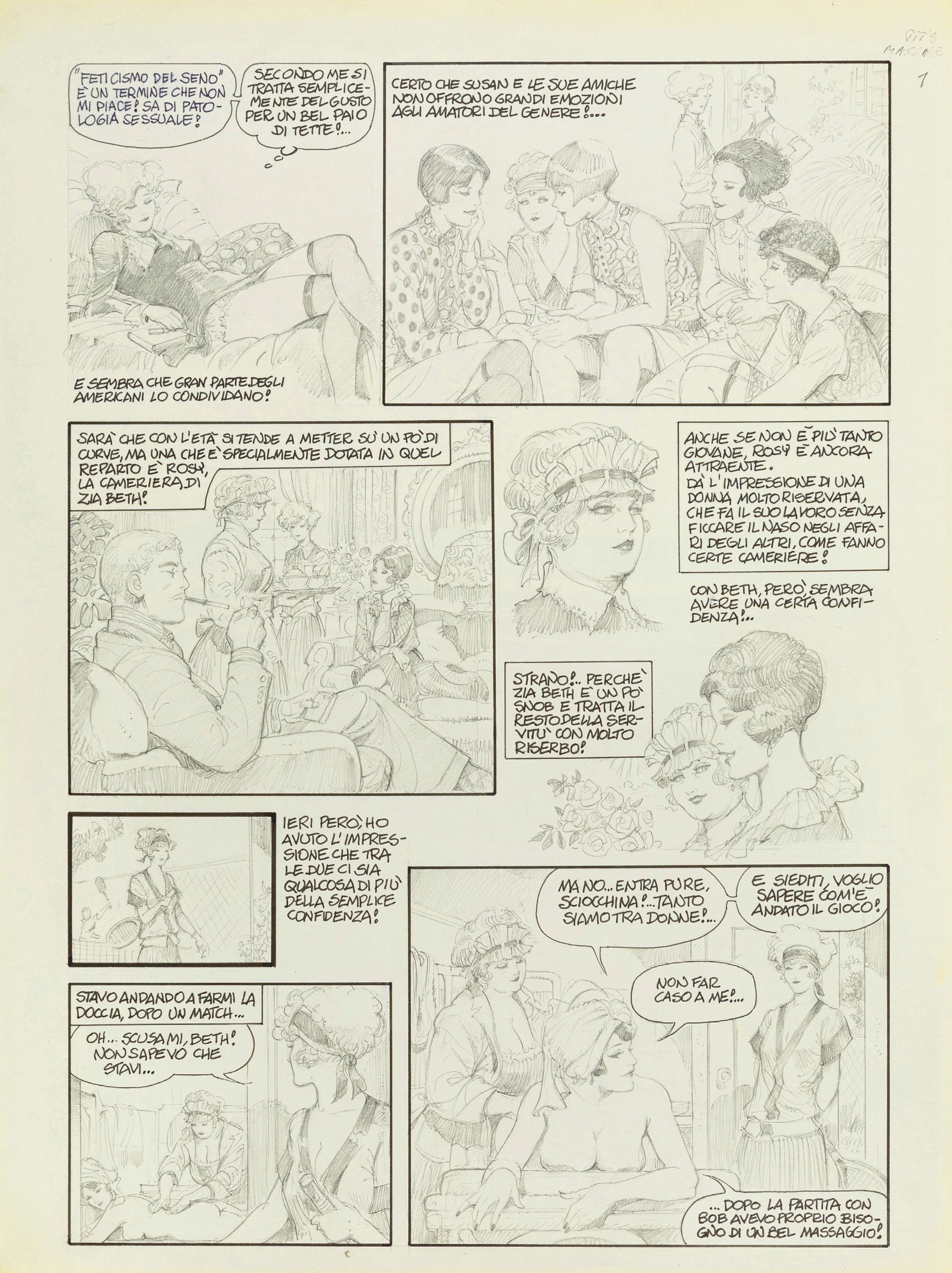 1991 Tavola originale realizzata da Frollo per 'Tith massage', avventura erotica della sua Mona edita a pag. 1 nel volume Mona Street 2: The Secret Books of Glamour dalla Glamour International nel 1991. Pubblicata in Francia nello stesso anno con il titolo 'Tits massages', segna la consacrazione di Frollo nell'Olimpo del fumetto erotico d'autore a livello mondiale. Siamo nella Boston degli anni Venti del Novecento, Mona Street è una scaltra fanciulla da poco uscita dal college, curve morbide candidamente ostentate, un viso innocente dallo sguardo ironico e un sorriso appena accennato sulle labbra. Mona Street è un normale nome inglese, ma se si pensa che Leone Frollo è veneziano allora il giocoso equivoco verbale diventa intuitivo. L'ammiccamento malizioso c'è già nel nome, dunque, ma tutte le storie di Mona Street sono sottese di ammorbante erotismo, ingegnosamente narrate dall'autore che, con un tratto morbido e voluttuoso a matita o china, ha tracciato un personaggio ben diverso dalle altre 'eroine del fumetto' quasi sempre succubi dell'uomo: Mona ha una personalità da falsa ingenua che si prende gioco di tutti, diventando a volte vindice del proprio sesso.