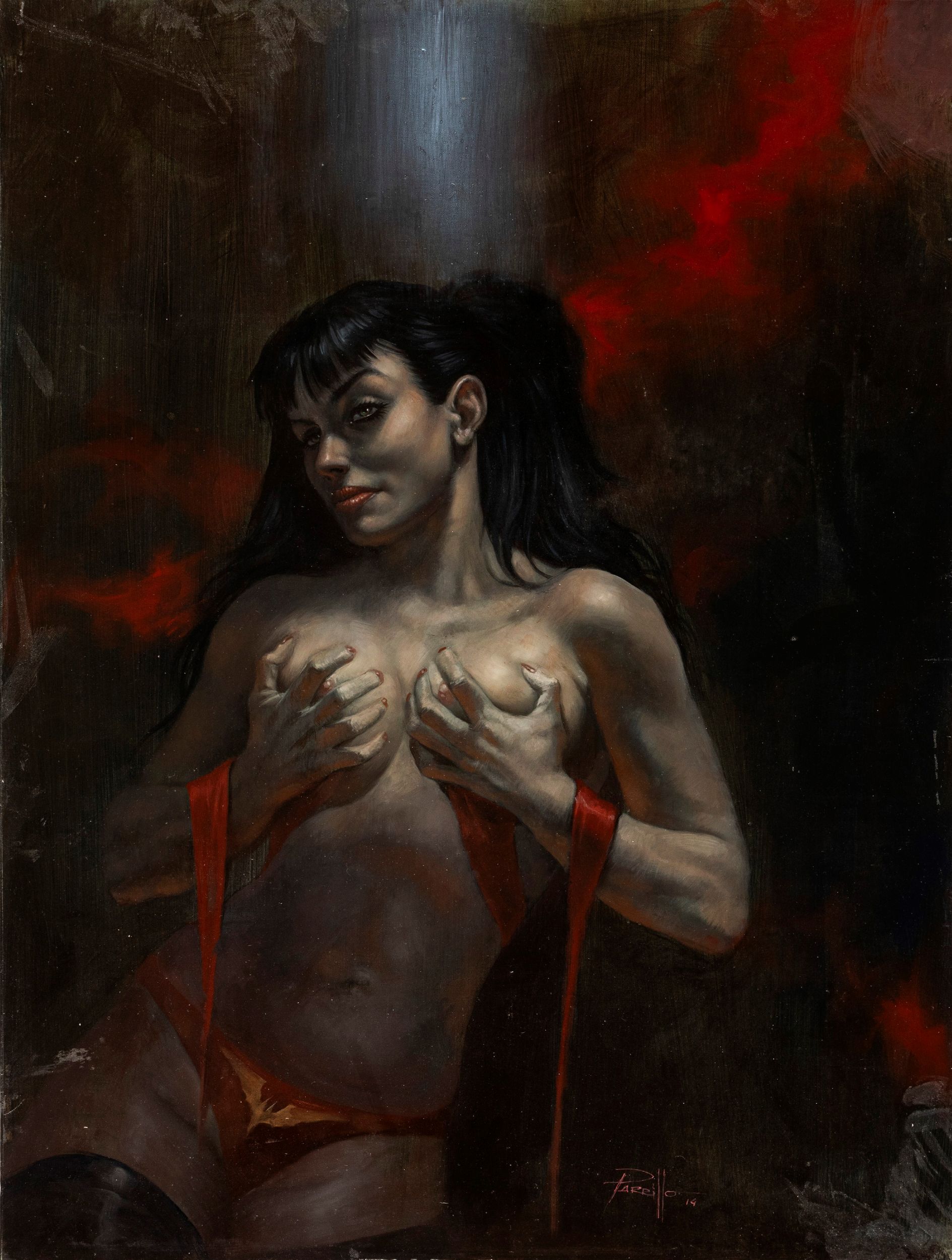 2014 Dipinto originale realizzato da Parrillo nel 2014, raffigurante una provocante e prosperosa Vampirella. Firmato e datato.
