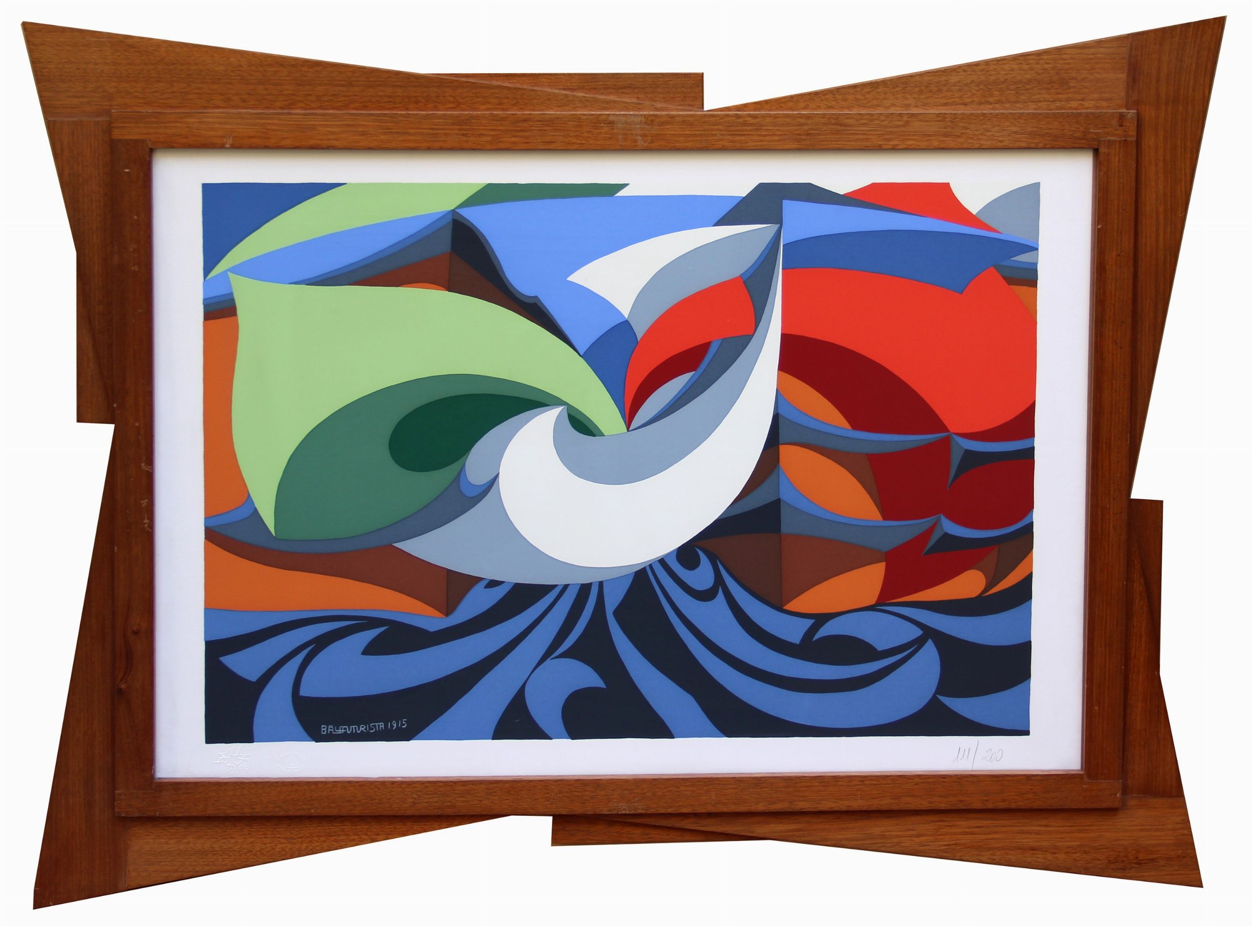 serigrafia a colori, cm 50x70 1915 La misura fa riferimento al foglio La misura comprensiva della cornice sagomata è di cm 67x88 Edizione di 200 esemplari Esemplare n. 111 Stampatore: Claudio Barbato, Venezia Firma, data 'Ballafuturista, 1915' (incisa in basso a sinistra) numerazione '111/200' (in basso a destra); timbri a secco di Balla Futurista e Claudio Barbato Venezia Spinea (in basso a sinistra)