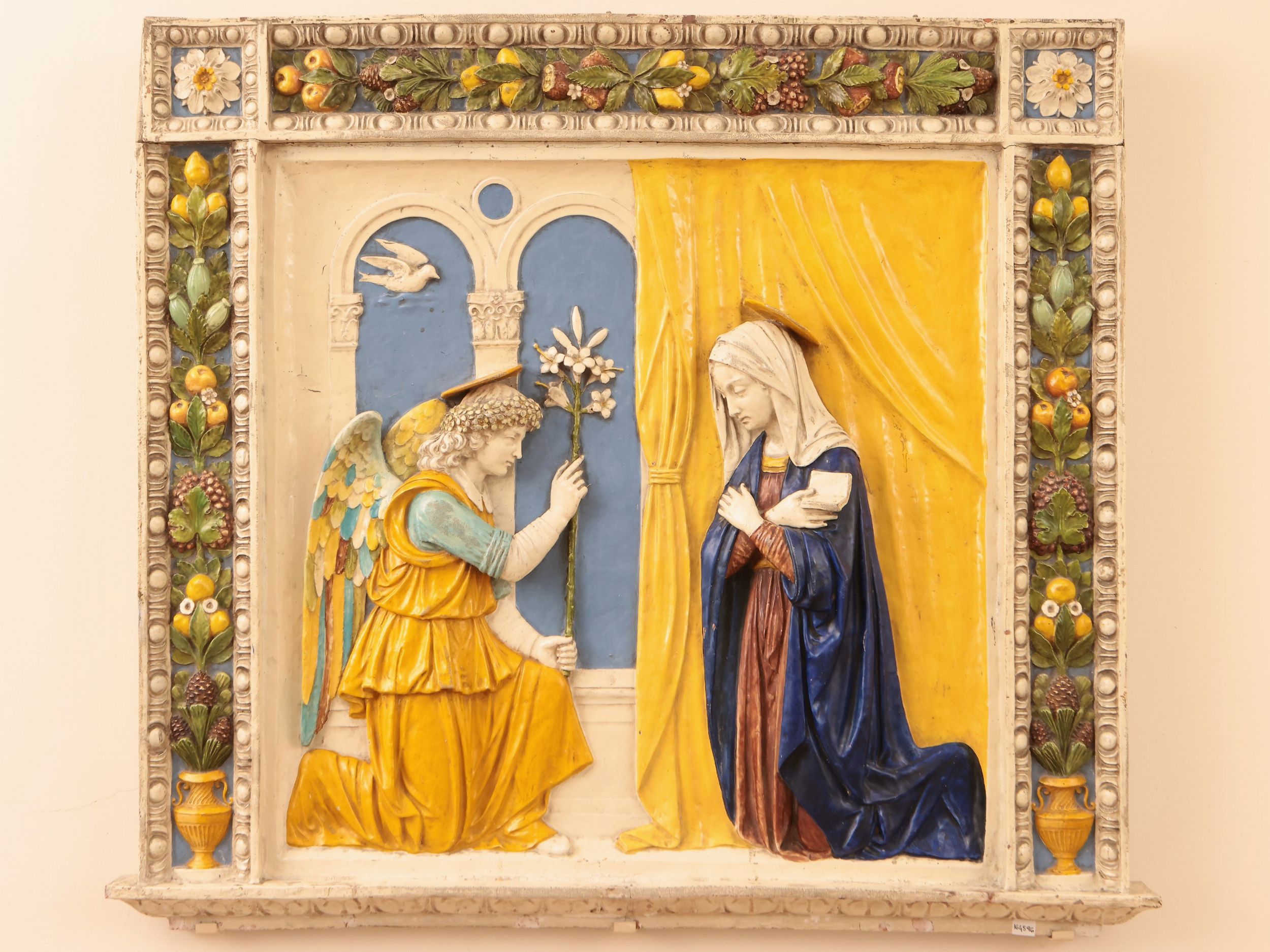 cm 85x100 XIX/XX secolo rilievo in terracotta invetriata, nel gusto delle maioliche robbiane del XV/XVI secolo, smaltato nei toni dell'ocra, del blu, del vinaccia e dell'azzurro, cornice ad ovuli decorata con motivo a festone di fiori e frutti che si dipartono da due vasi, raffigurante la Vergine Maria inginocchiata in un interno con scorcio di colonnato e tendaggio drappeggiato, insieme all'arcangelo Gabriele che le porge dei gigli