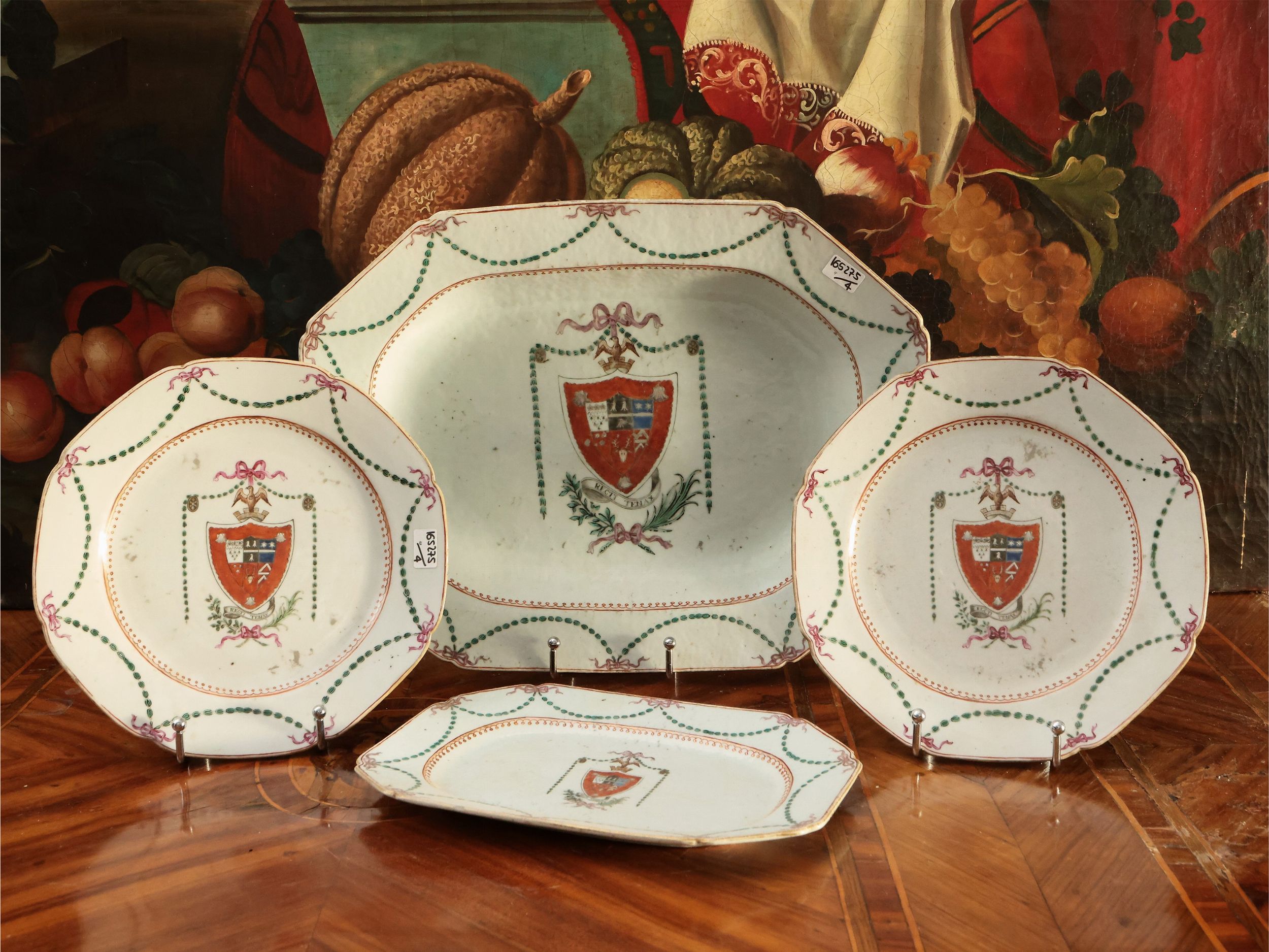 Cina, fine del XVIII secolo composto da due piatti e due vassoi a scalare facenti parte di un servizio più ampio, centrati da stemma gentilizio e dipinti con nastri rosa da cui si dipanano fili di perle