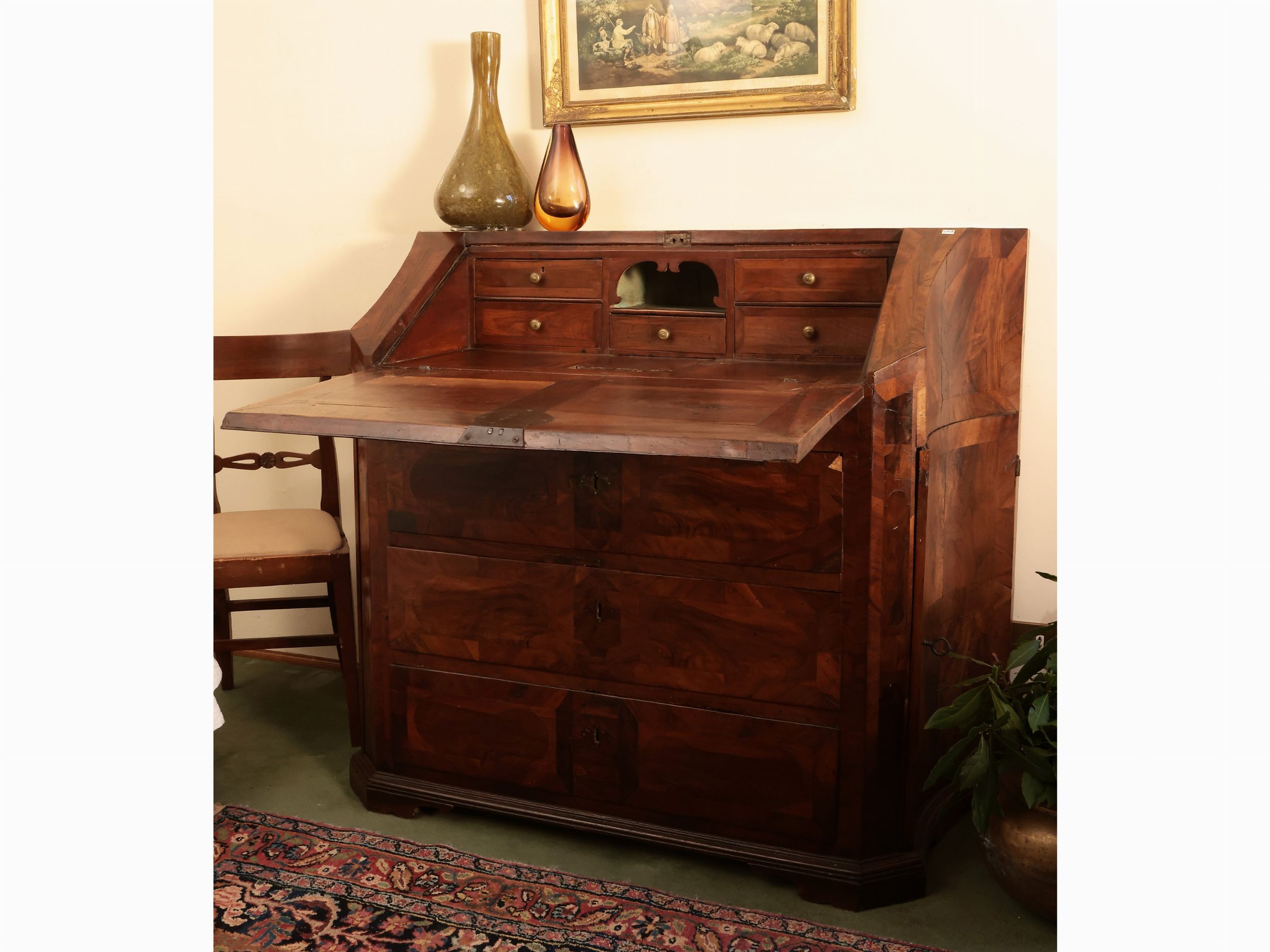h cm 114x135x60 seconda metà del XVIII secolo sportello a calatoio a celare scarabattolo con vani a giorno, cassettini e segreto, tre cassetti sul fronte dritto, angoli scantonati, fianchi convessi con sportelli, piedi a mensola, alcuni difetti